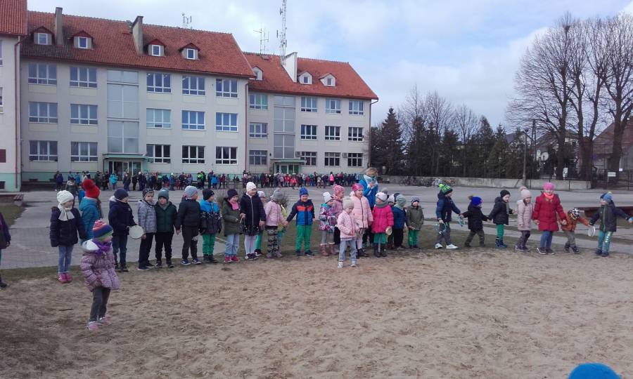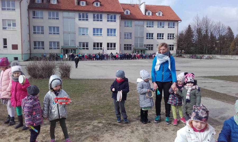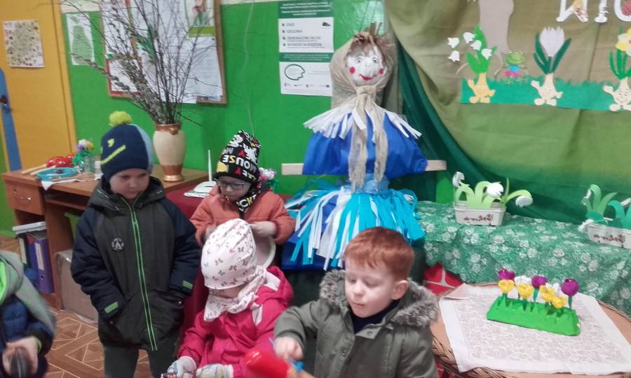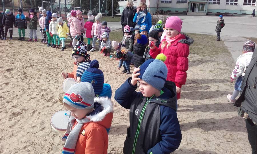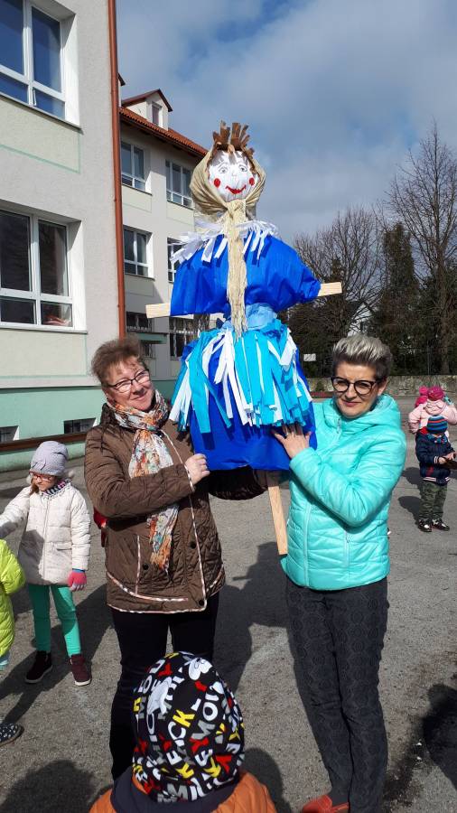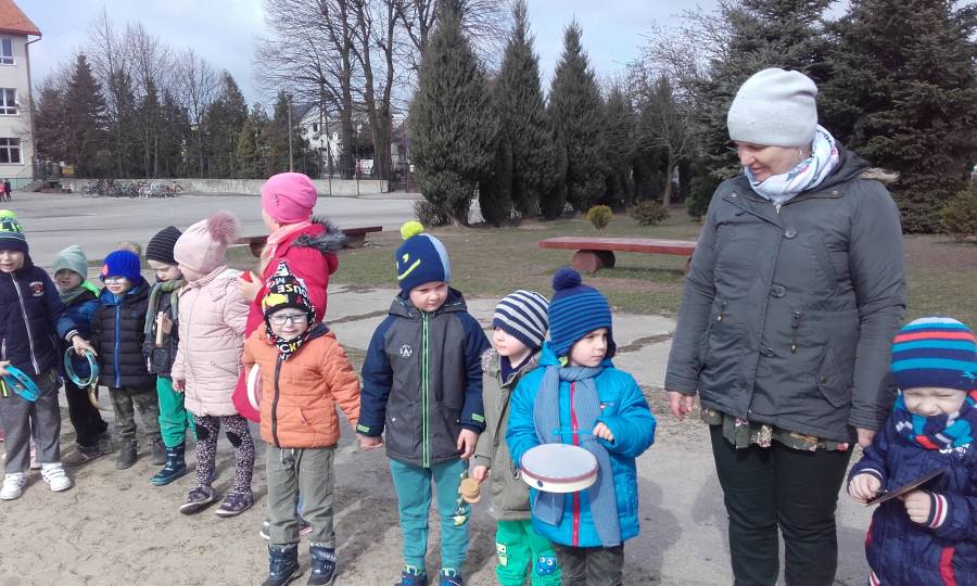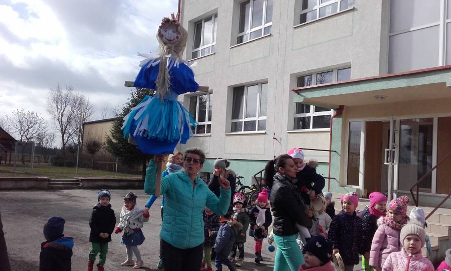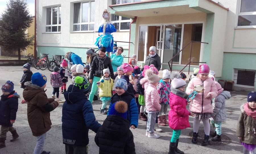 Dzisiaj w naszym przedszkolu pożegnaliśmy Panią Zimę i przywitaliśmy oczekiwaną z niecierpliwością Panią Wiosnę, która w dniu swego przyjścia podarowała nam słoneczną pogodę. Wszystkie przedszkolaki przemaszerowały wokół szkoły grając na instrumentach perkusyjnych witając nową porę roku.Następnie spaliliśmy Marzannę - symbol odchodzącej zimy .W tym pierwszym dniu wiosny było u nas wesoło i kolorowo, większość dzieci tradycyjnie ubrała się w na zielono..