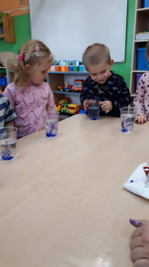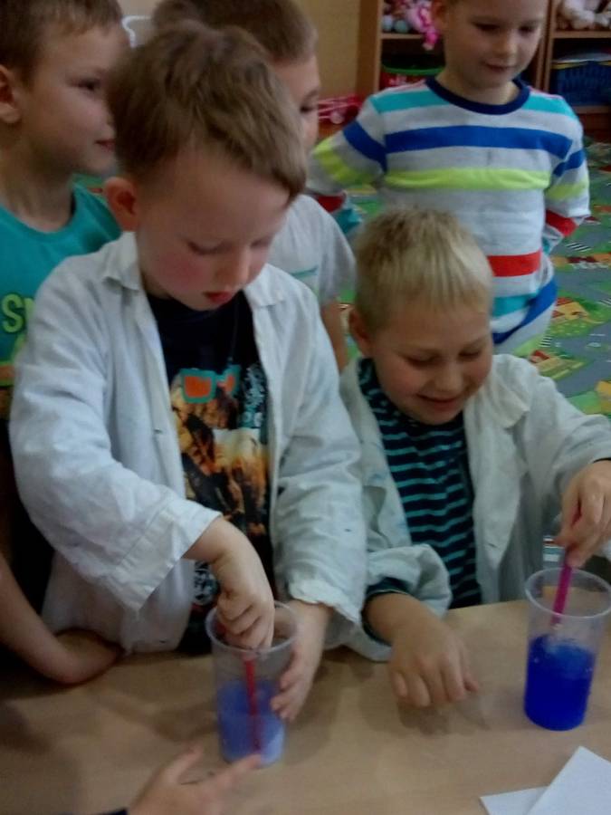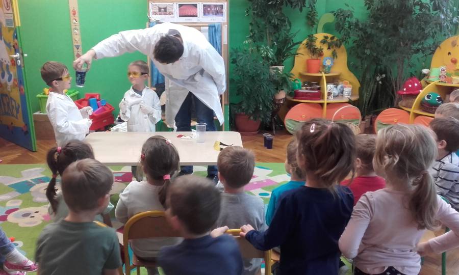 22 listopada gościliśmy w naszym przedszkolu pana Bartosza Pałuckiego z Torunia, który zaprezezentował dzieciom zajęcia edukacyjne pt: "Smerfowe eksperymenty".Smerfy kojarzą się wszystkim z kolorem niebieskim i takie też były eksperymenty - z atramentem i wodą w roli głównej. Pan Bartek w bardzo przystępny i wesoły sposób pokazywał dzieciom jak w wodzie znika atrament i po chwili pojawia się po dodaniu tajemniczej substancji. Była też niebieska fontanna i wiele innych atrakcyjnych eksperymentów. Dzieci z ogromnym zainteresowaniem przyglądały się poczynaniom pana Bartka i aktywnie pomagały w eksperymentowaniu.