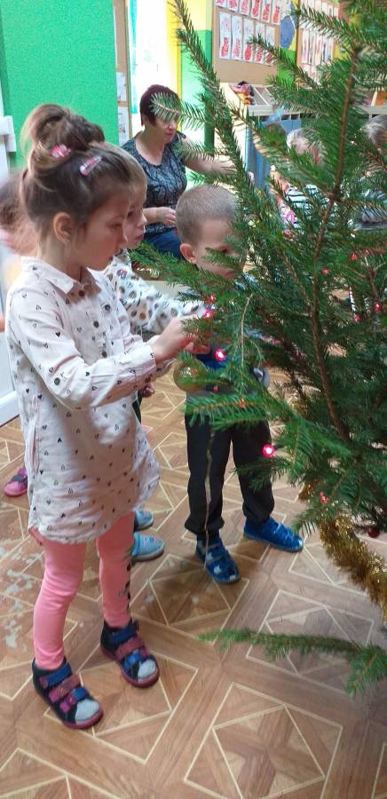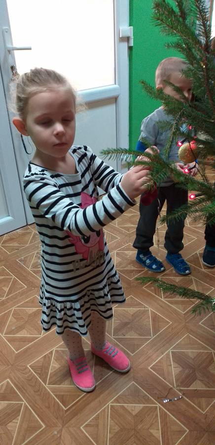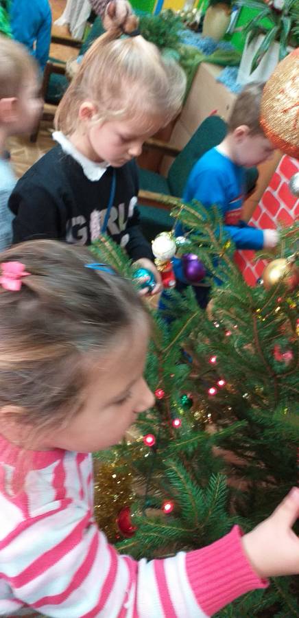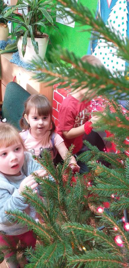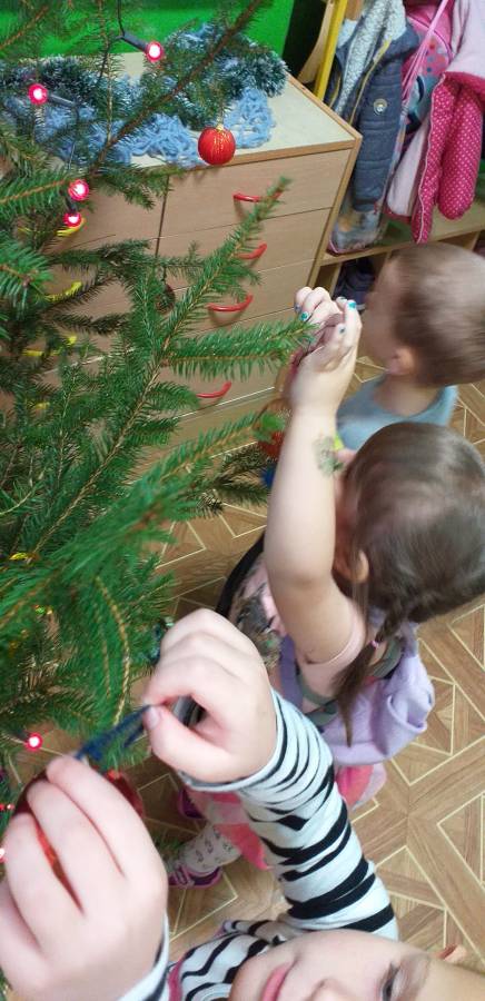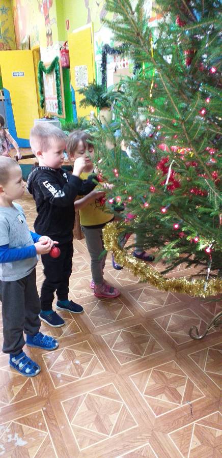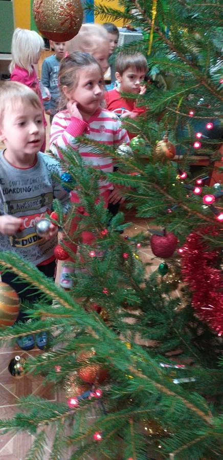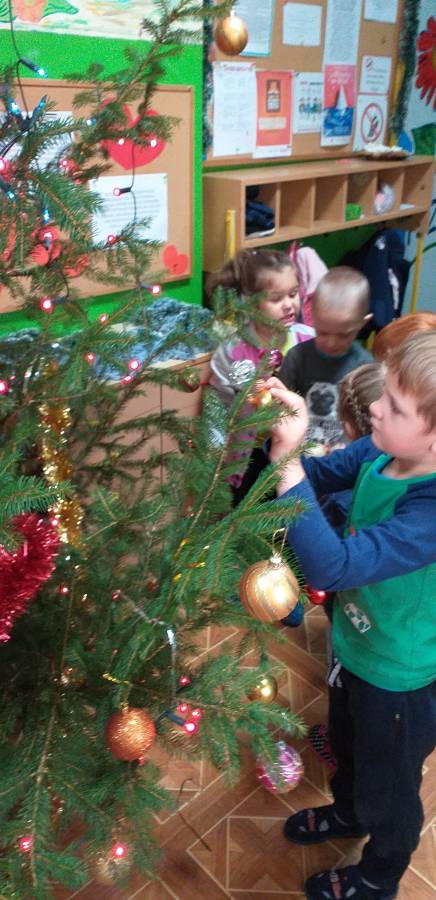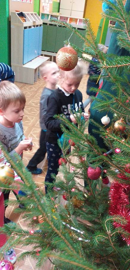 Dzieci z utęsknieniem czekają na chwilę ubierania świątecznej choinki, która jest nieodłącznym symbolem świąt Bożego Narodzenia. Kiedy w  naszym przedszkolu pojawiło się zielone drzewko, które zostało ofiarowane przez Nadleśnictwo Zamrzenica, dzieci przystąpiły do jego ozdabiania. Dzięki temu nasza choinka wygląda prześlicznie, aż chce się zaśpiewać piosenkę: