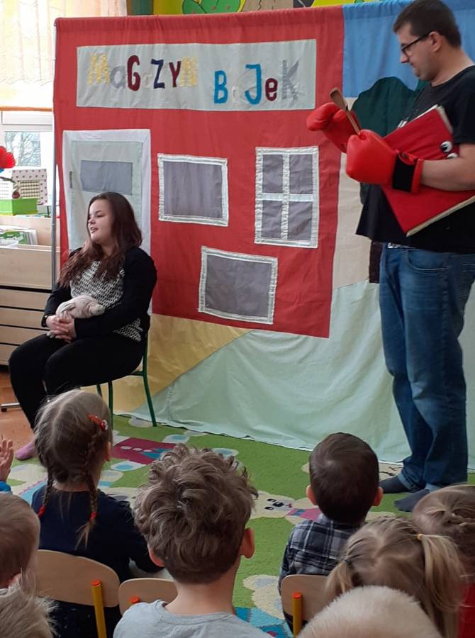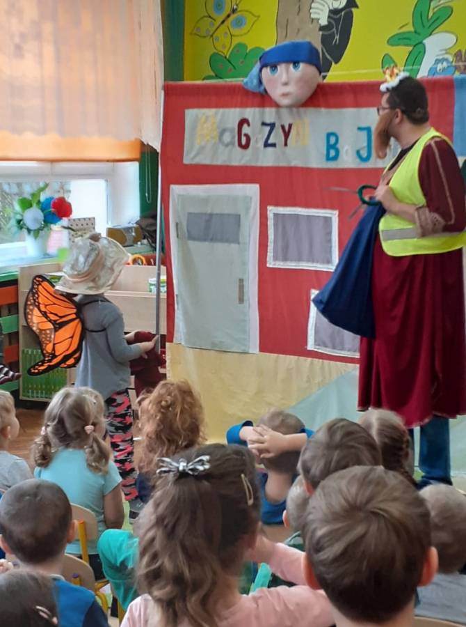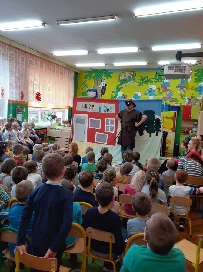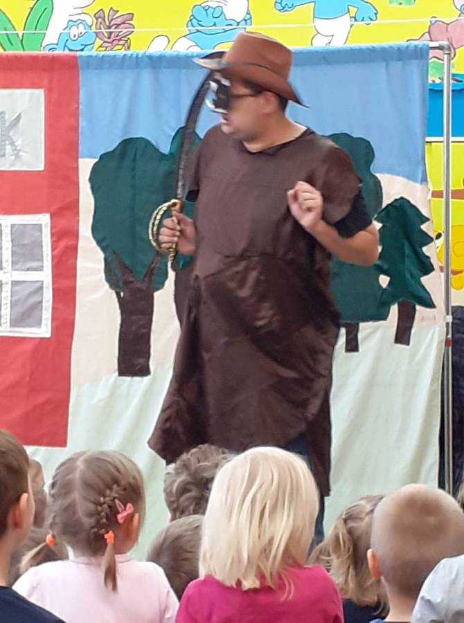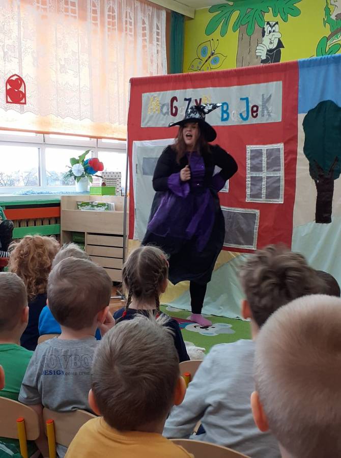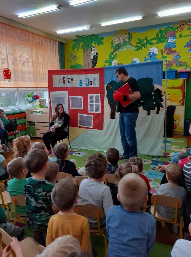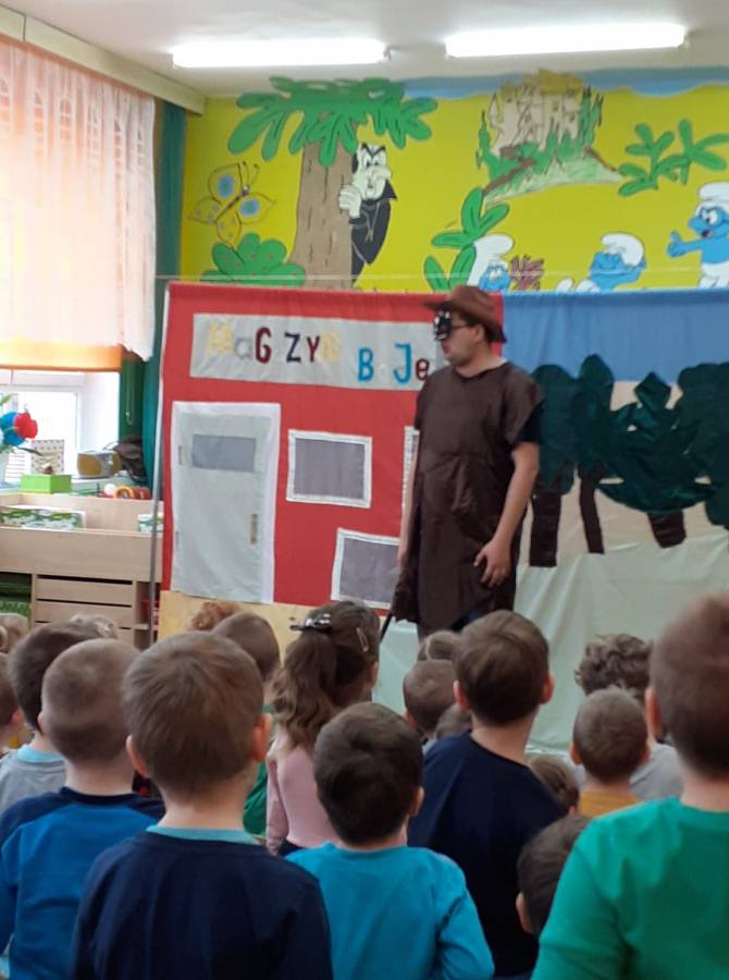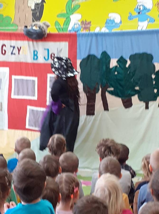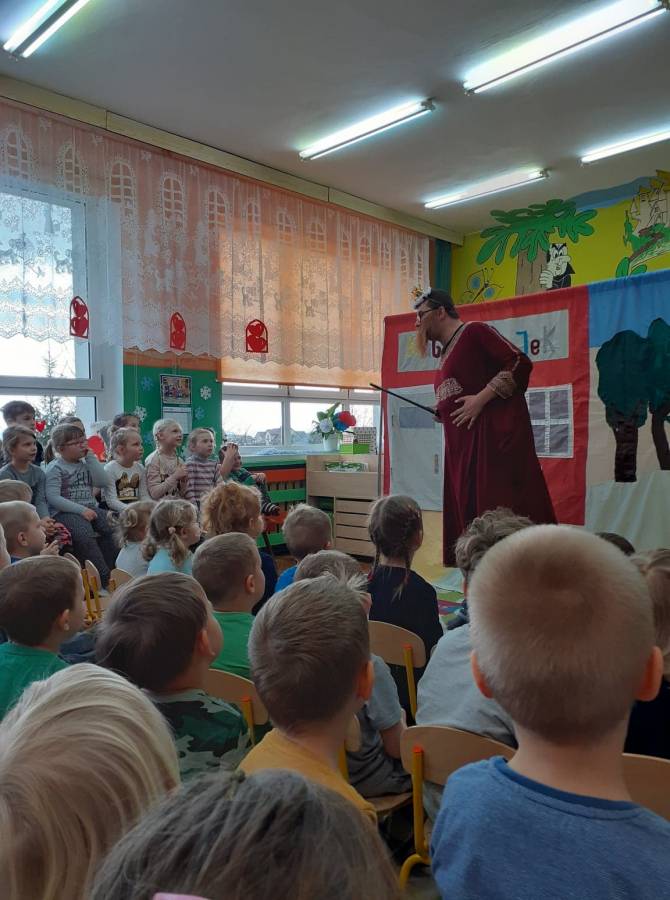 We wtorek 18.02. w naszym przedszkolu gościli aktorzy ze Teatru AKADA z Suwałk z przedstawieniem „Zamieszanie w krainie bajek". Dzieciom bardzo spodobał się zamęt, jaki panował w tej krainie i z radością reagowały na to, co działo się na scenie. Przedszkolaki mogły także wykazać się znajomością bajek, zauważając wszystkie nieprawidłowości, jakie się pojawiały w bajce. Na zakończenie spektaklu dzieci stwierdziły, że bohaterowie powinni wrócić do swoich bajek.