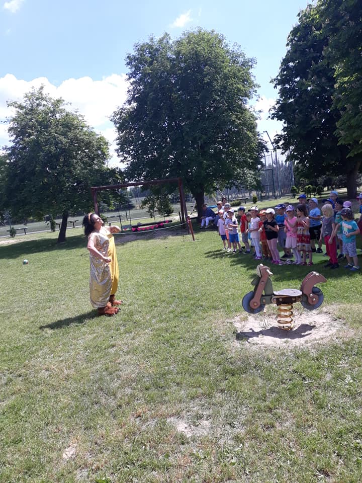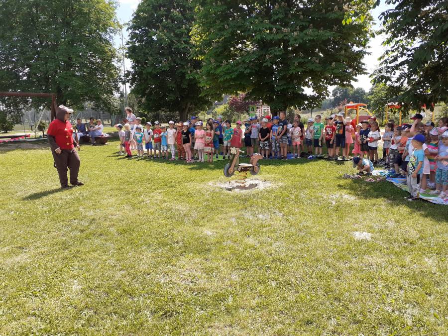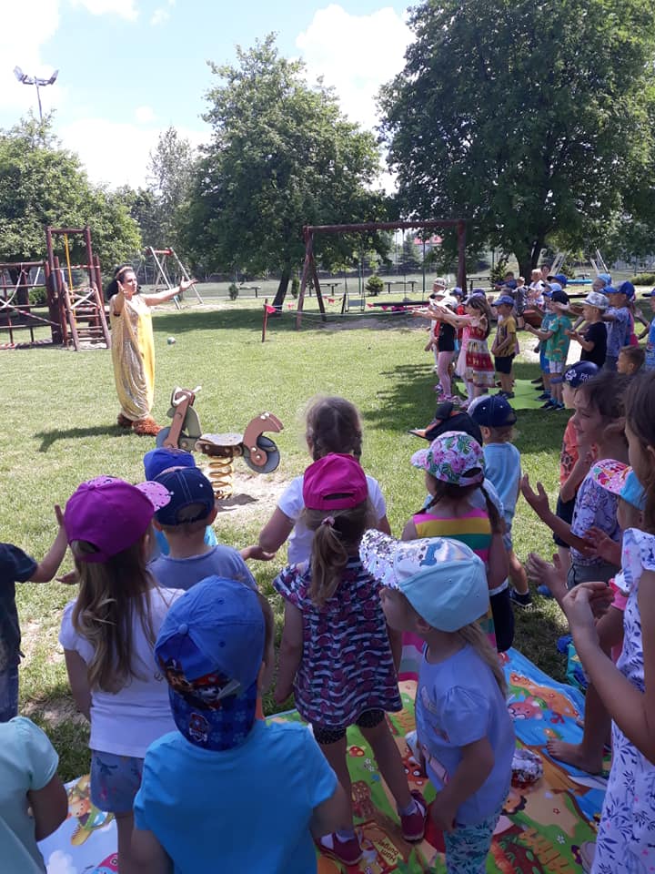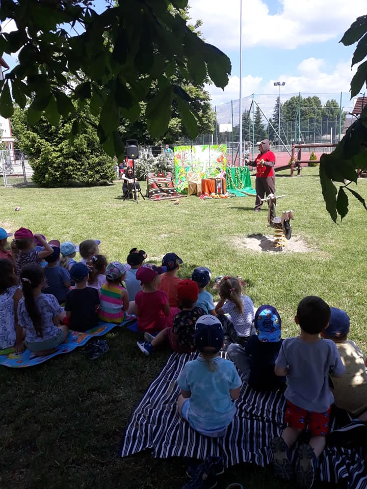 Dzieci z wielką radością obejrzały na żywo, pierwszy raz w tym roku szkolnym, teatrzyk edukacyjny z udziałem aktorów. Ze względu na wciąż trwajacą pandemię, przedstawienie odbyło się na przedszkolnym placu zabaw. Aktorzy Teatru Bajecznego z Bydgoszczy przedstawili spektakl edukacyjny pt: "Król dzungli", którego głowny bohater - Lew Teodor musiał zmierzyć się z wieloma trudnościami, aby uchronić piekną dżunglę od zagłady. Ta barwna opowieść mówiła o tym, że złość i agresja nie są właściwymi metodami na radzenie sobie z problemami. Dzieci aktywnie uczestniczyły w przedstawieniu, a także przypomniały sobie zasady savoir - vivre.