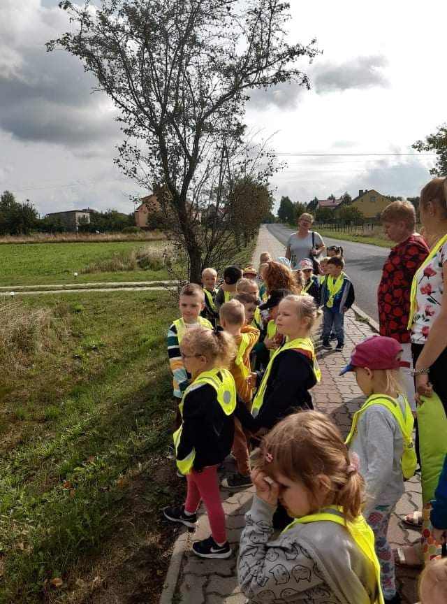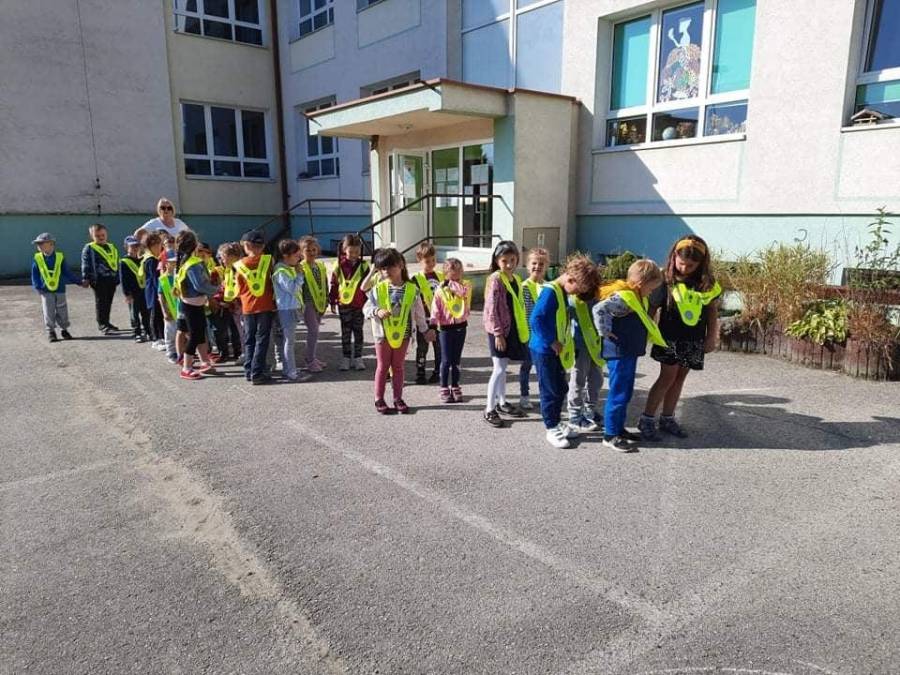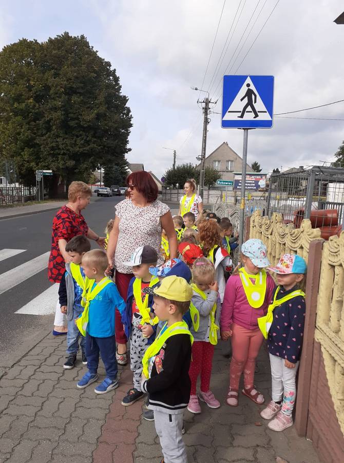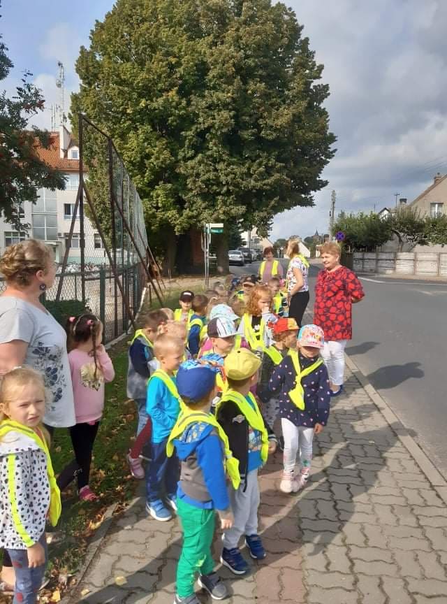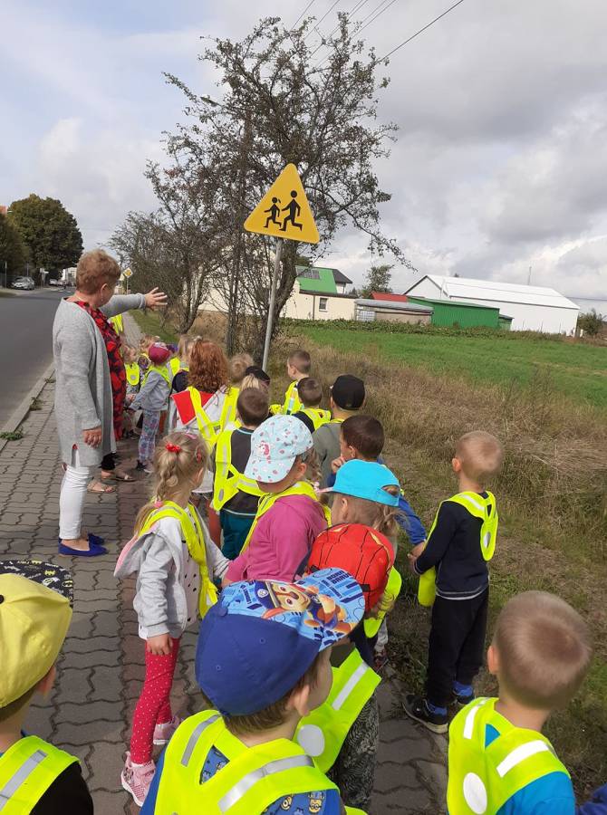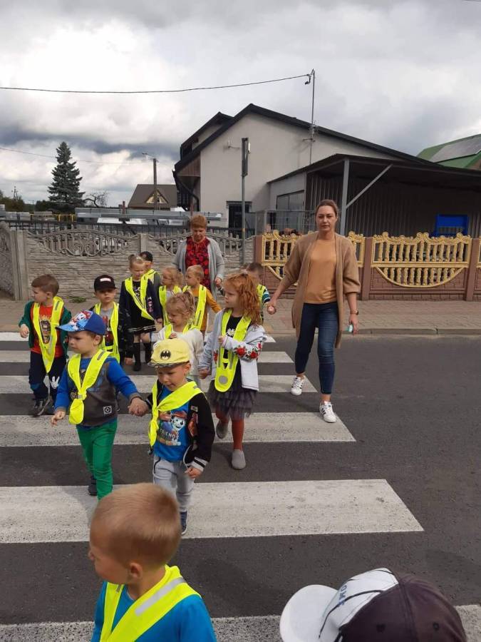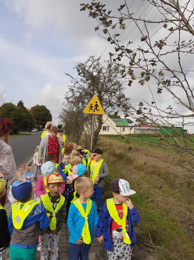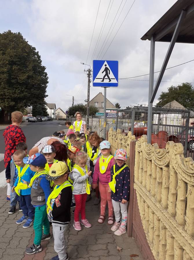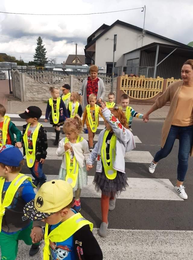 Poznawanie przez dzieci zasad ruchu drogowego już od najmłodszych lat wpływa na ich bezpieczne zachowanie na drodze. Nasze przedszkolaki, aby poznać owe zasady, ubrane w kamizelki odblaskowe wyruszyły na wycieczkę, podczas której uczyły się właściwego postępowania w ruchu ulicznym, ćwiczyły prawidłowe przechodzenie przez jezdnię, obserwowały ruch uliczny i poznawały znaczenie niektórych znaków drogowych.