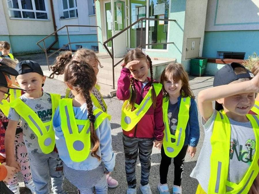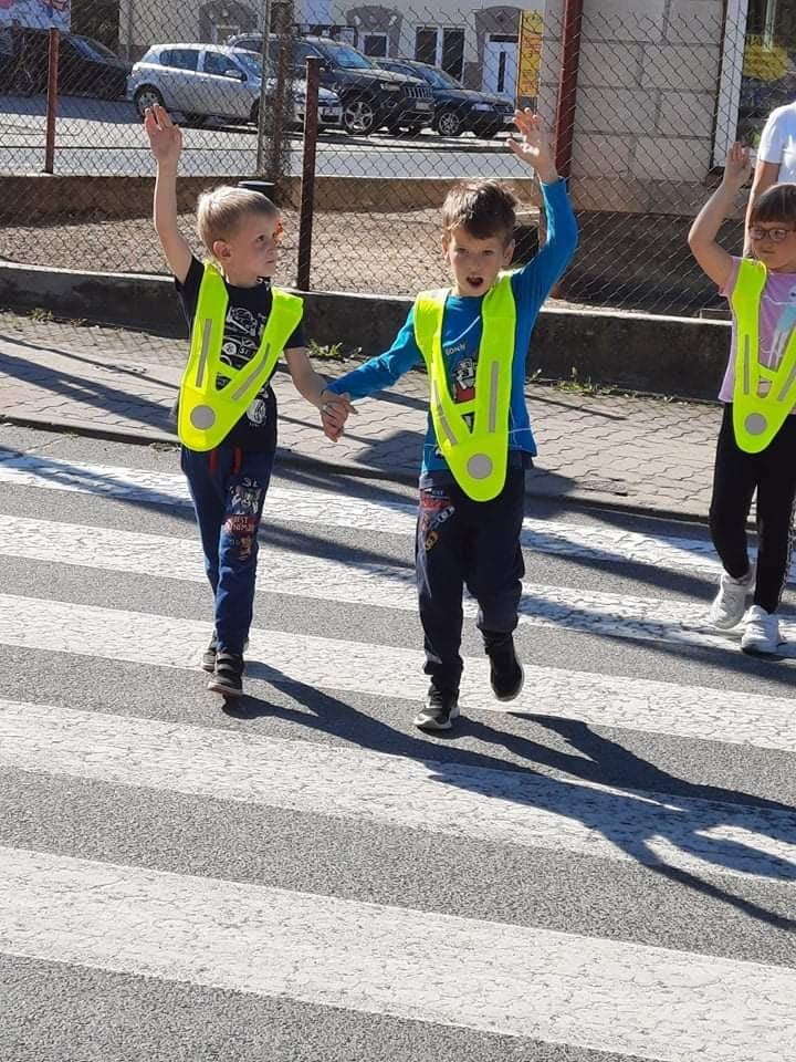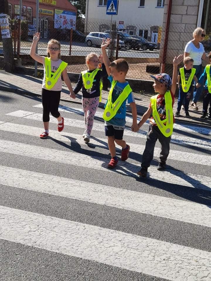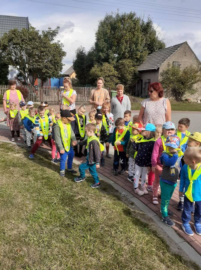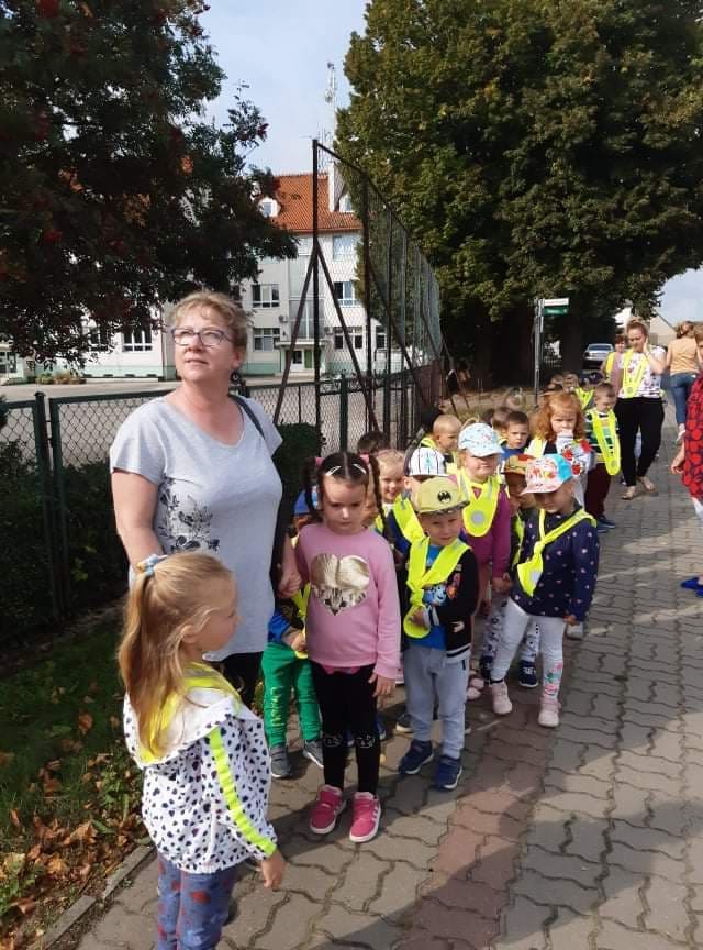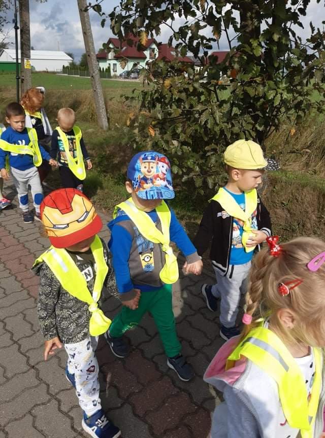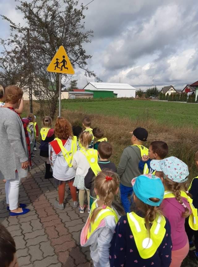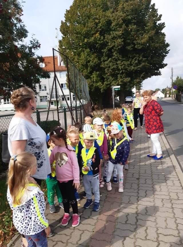Poznawanie przez dzieci zasad ruchu drogowego już od najmłodszych lat wpływa na ich bezpieczne zachowanie na drodze. Nasze przedszkolaki, aby poznać owe zasady, ubrane w kamizelki odblaskowe wyruszyły na wycieczkę, podczas której uczyły się właściwego postępowania w ruchu ulicznym, ćwiczyły prawidłowe przechodzenie przez jezdnię, obserwowały ruch uliczny i poznawały znaczenie niektórych znaków drogowych.