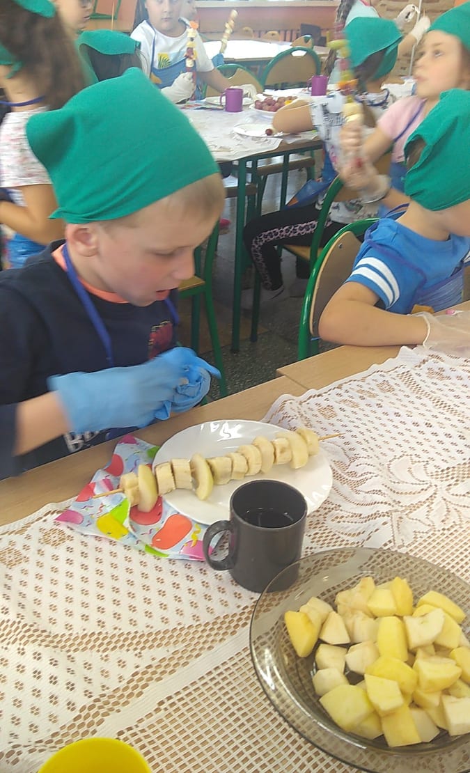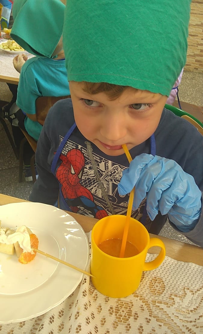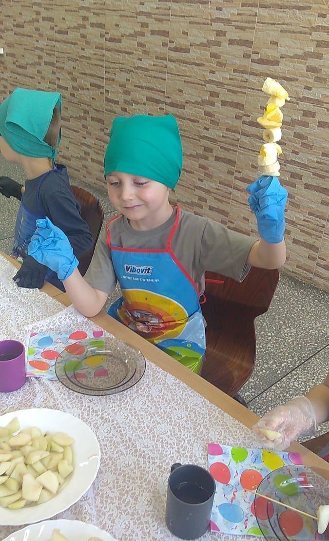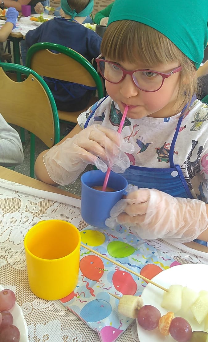Potem poszły w ruch patyki i pokrojone owoce. Jak widać po minach wszystkim smakowało. Z pozostałych owoców przy pomocy sokowirówki wyciskaliśmy sok. Pyszka!