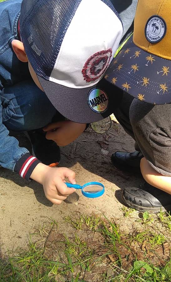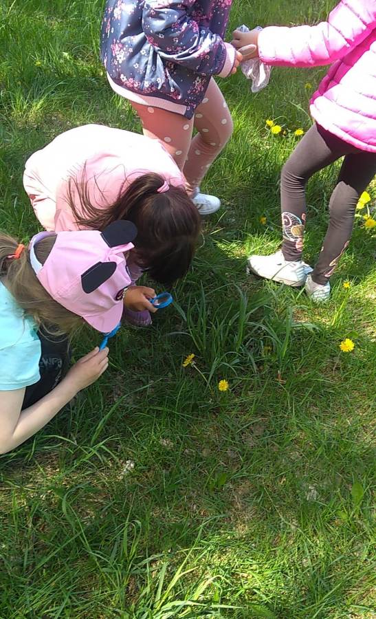 Dziś Motylki i Biedronki, uzbrojone w lupy, wybrały się na majową łąkę. Oglądaliśmy rośliny i małe zwierzątka w trawie, słuchaliśmy koncertu żab nad stawem.