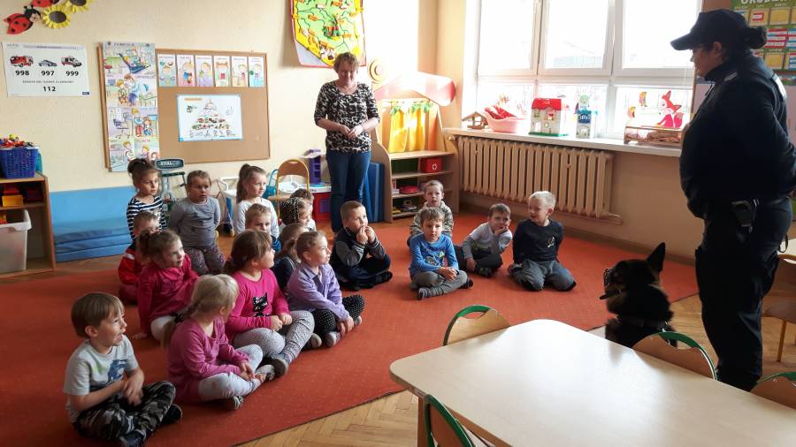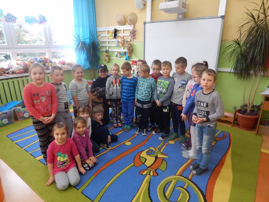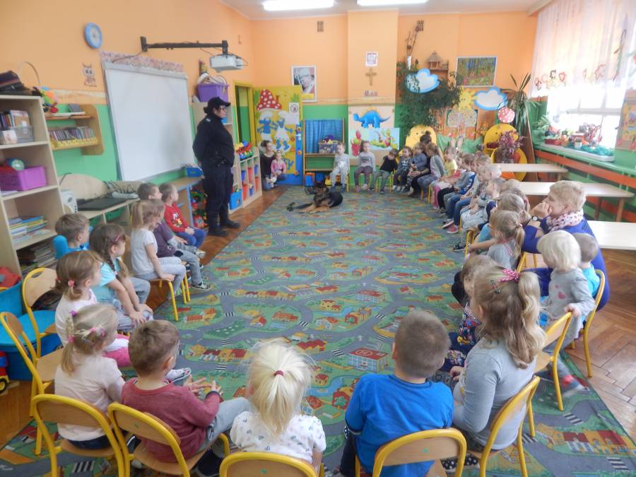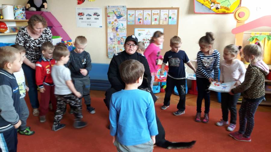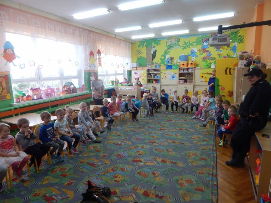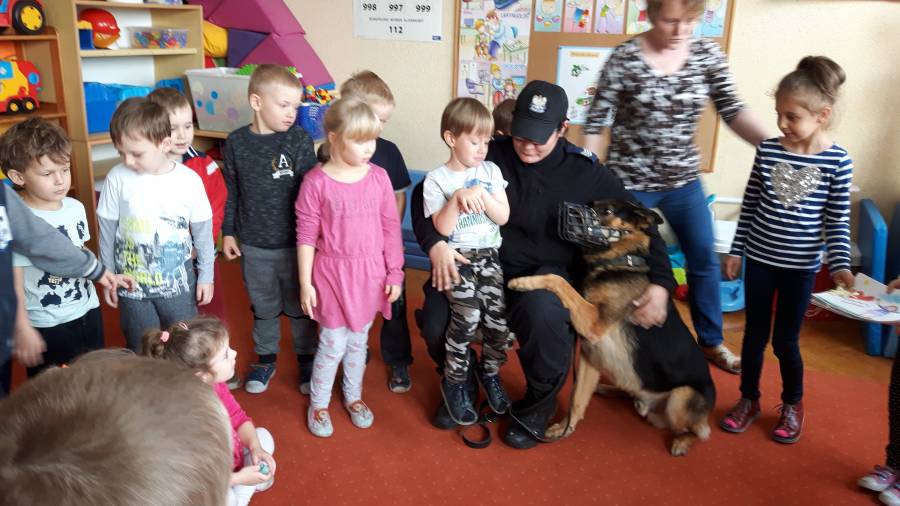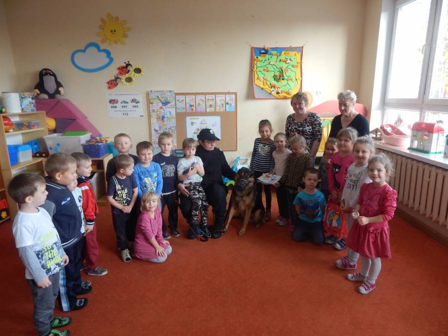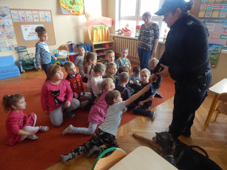W dniu 16.11.2017 r. w naszym przedszkolu odbyło się niezwykłe spotkanie z panią policjantką sierżantem sztabowym Iwoną Czajkowską z Komendy Powiatowej Policji w Sępólnie Krajeńskim i Reksem czyli psem patrolowo -tropiącym, którym pani Iwona się opiekuje. Podczas spotkania przedszkolacy dowiedzieli się o tym jak bezpiecznie poruszać się po drogach, podróżować samochodem, bawić w domu i w przedszkolu, oraz jak reagować w sytuacji innych zagrożeń, np. zasłabnięcie kogoś bliskiego, pożaru itp.. Pani Iwona ostrzegała również przed osobami nieznajomymi, z którymi nie wolno rozmawiać, brać od nich czegokolwiek ani wpuszczać ich do domu. Dzieci poznały zasady obchodzenia się z obcym, nierzadko agresywnym psem, ćwiczyły  postawę jaką powinny przyjąć podczas spotkania z takim zwierzakiem, dowiedziały się jakie zadanie ma do spełnienia pies policyjny patrolowo - tropiący na służbie. Reksio, który podczas całego spotkania był bardzo posłuszny swojej pani przewodnik, na zakończenie zaprezentował  swoje umiejętności. Przedszkolaki zadawały mnóstwo pytań i czynnie uczestniczyły w spotkaniu, które odbyło się dzięki uprzejmości Inspektora Pawła Zawady z Komendy Powiatowej Policji w Sępólnie Krajeńskim.