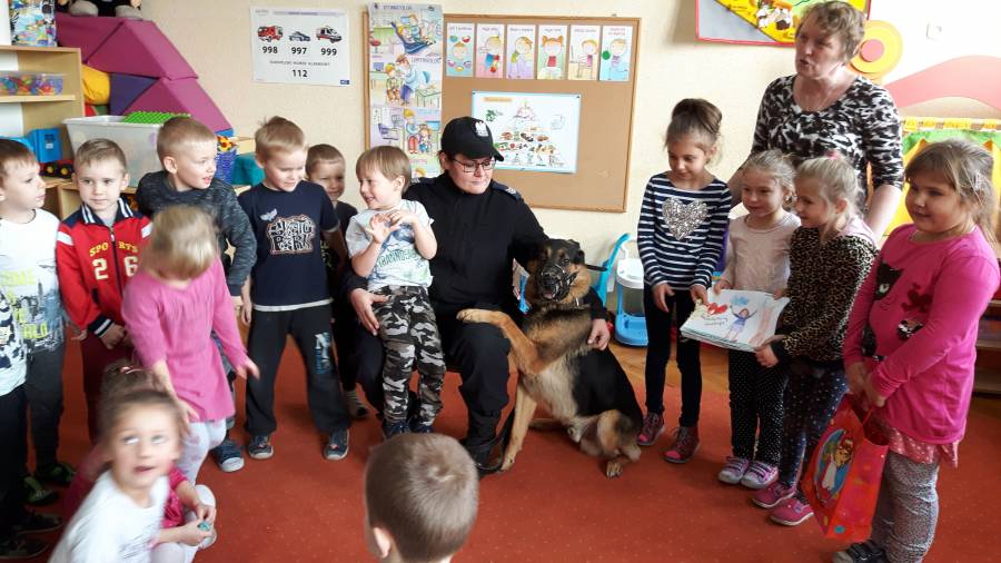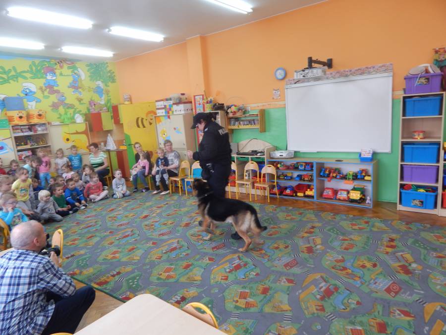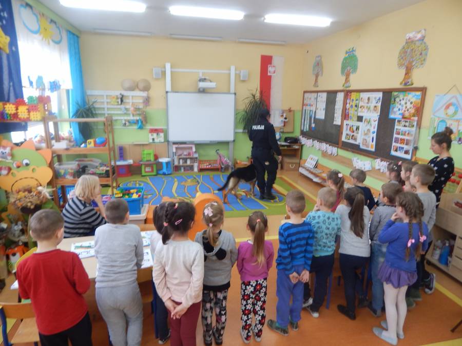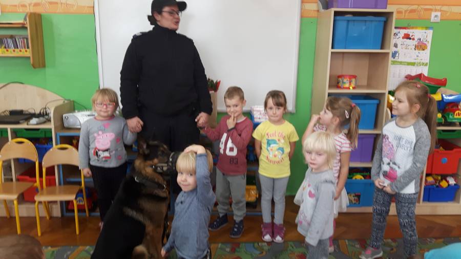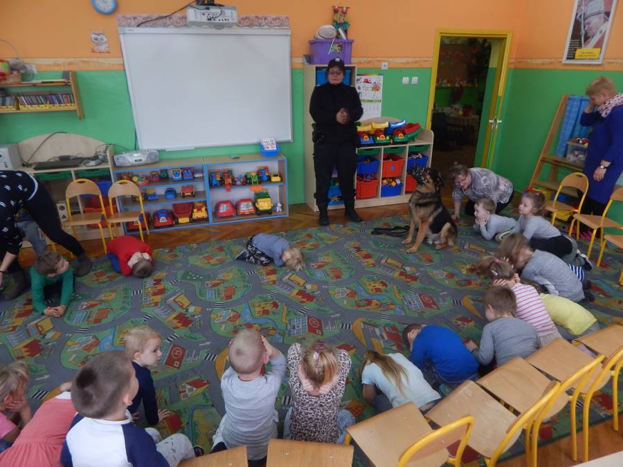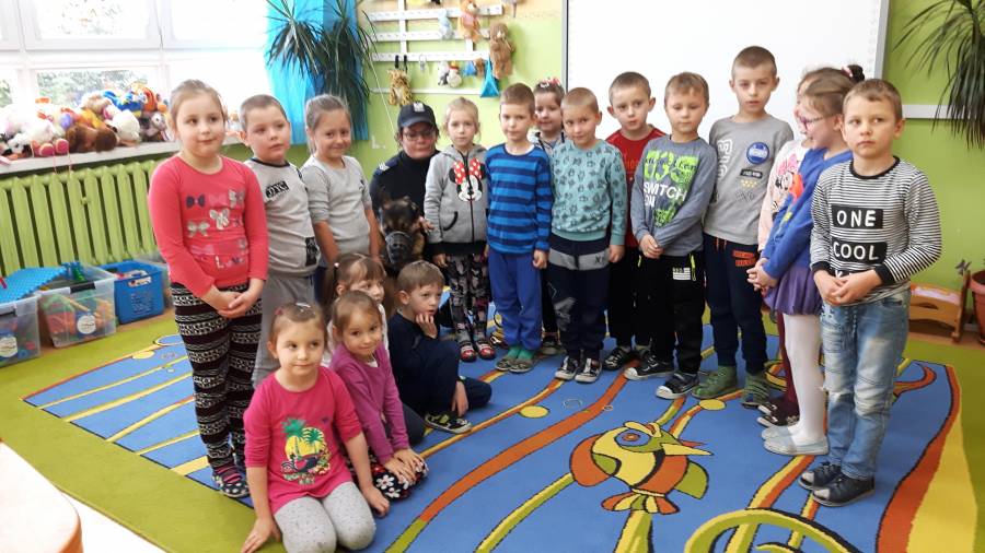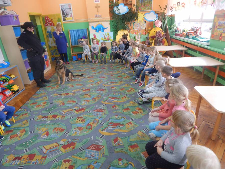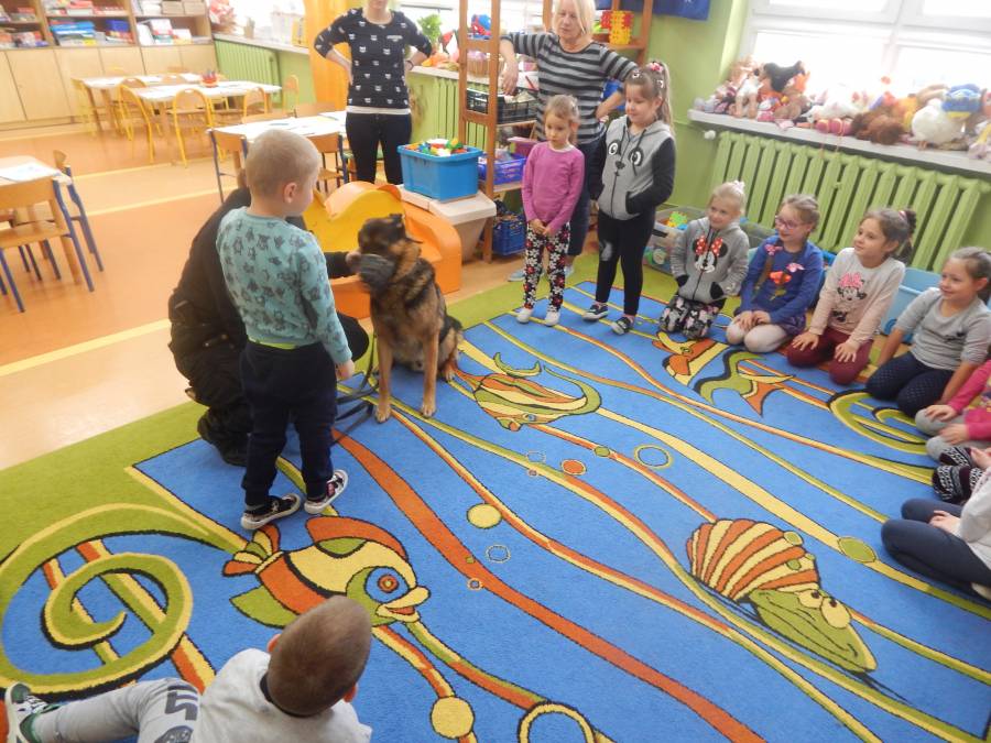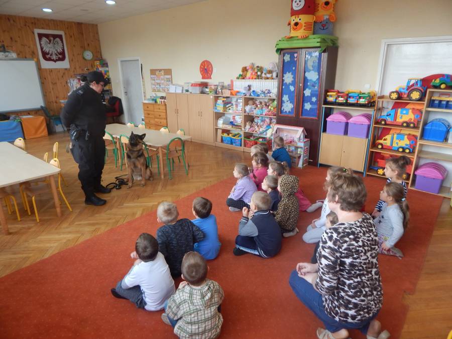 W dniu 16.11.2017 r. w naszym przedszkolu odbyło się niezwykłe spotkanie z panią policjantką sierżantem sztabowym Iwoną Czajkowską z Komendy Powiatowej Policji w Sępólnie Krajeńskim i Reksem czyli psem patrolowo -tropiącym, którym pani Iwona się opiekuje. Podczas spotkania przedszkolacy dowiedzieli się o tym jak bezpiecznie poruszać się po drogach, podróżować samochodem, bawić w domu i w przedszkolu, oraz jak reagować w sytuacji innych zagrożeń, np. zasłabnięcie kogoś bliskiego, pożaru itp.. Pani Iwona ostrzegała również przed osobami nieznajomymi, z którymi nie wolno rozmawiać, brać od nich czegokolwiek ani wpuszczać ich do domu. Dzieci poznały zasady obchodzenia się z obcym, nierzadko agresywnym psem, ćwiczyły  postawę jaką powinny przyjąć podczas spotkania z takim zwierzakiem, dowiedziały się jakie zadanie ma do spełnienia pies policyjny patrolowo - tropiący na służbie. Reksio, który podczas całego spotkania był bardzo posłuszny swojej pani przewodnik, na zakończenie zaprezentował  swoje umiejętności. Przedszkolaki zadawały mnóstwo pytań i czynnie uczestniczyły w spotkaniu, które odbyło się dzięki uprzejmości Inspektora Pawła Zawady z Komendy Powiatowej Policji w Sępólnie Krajeńskim.