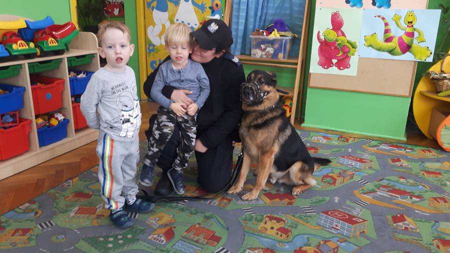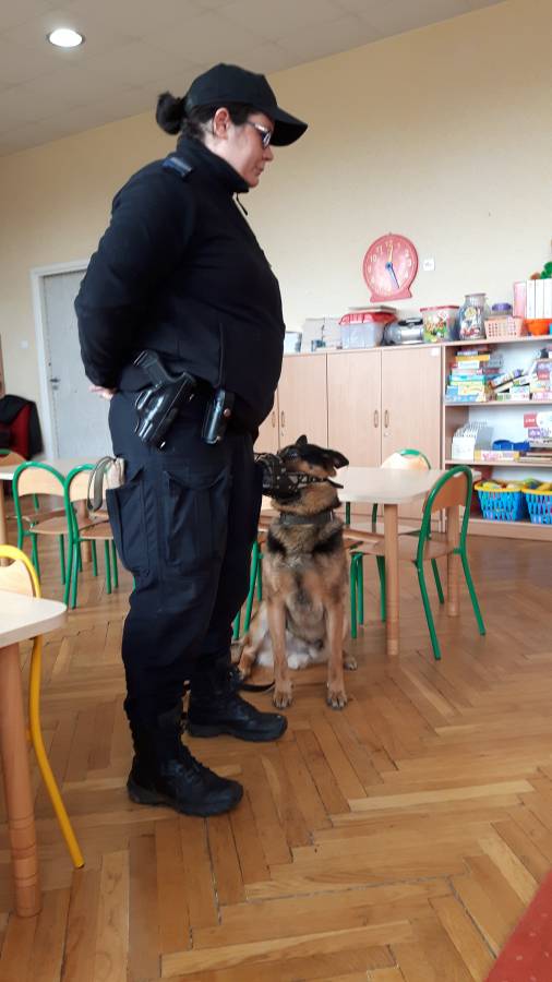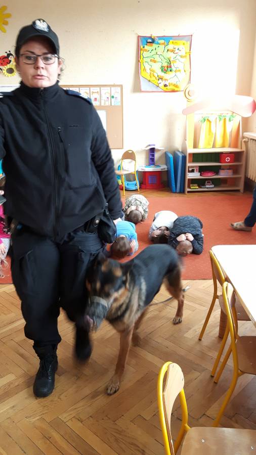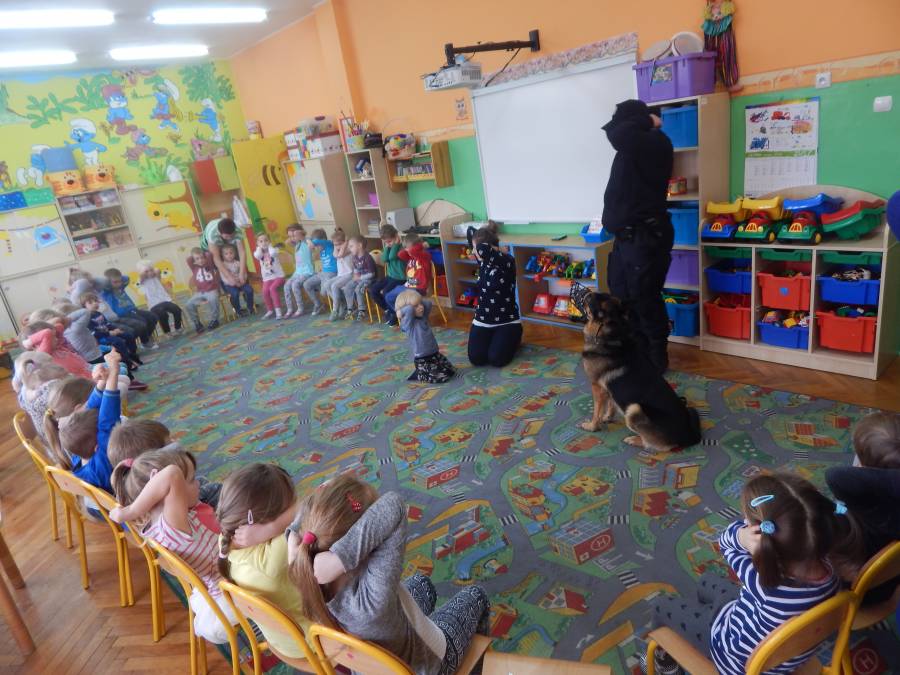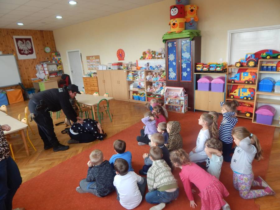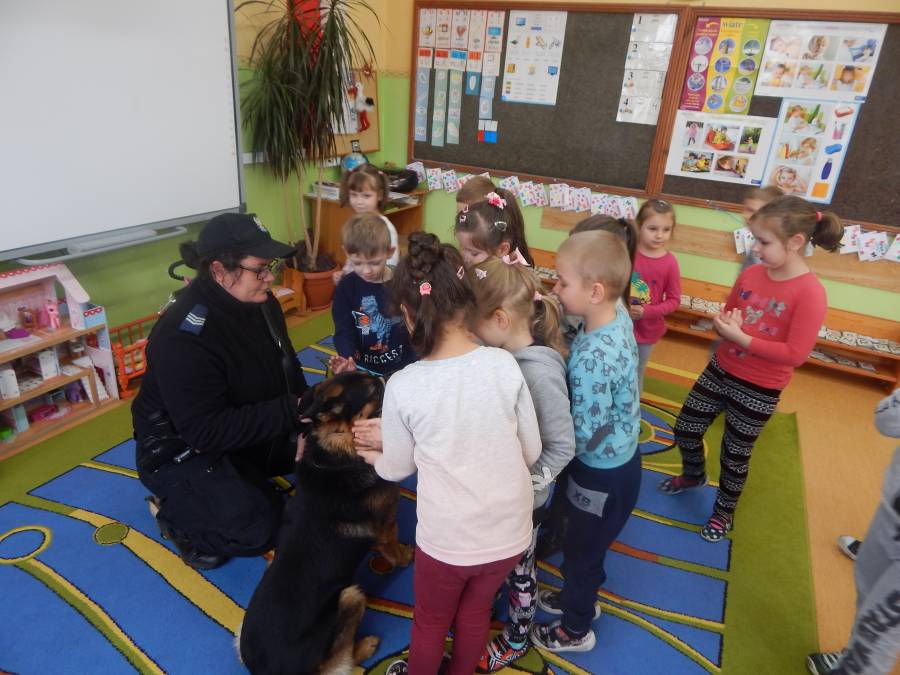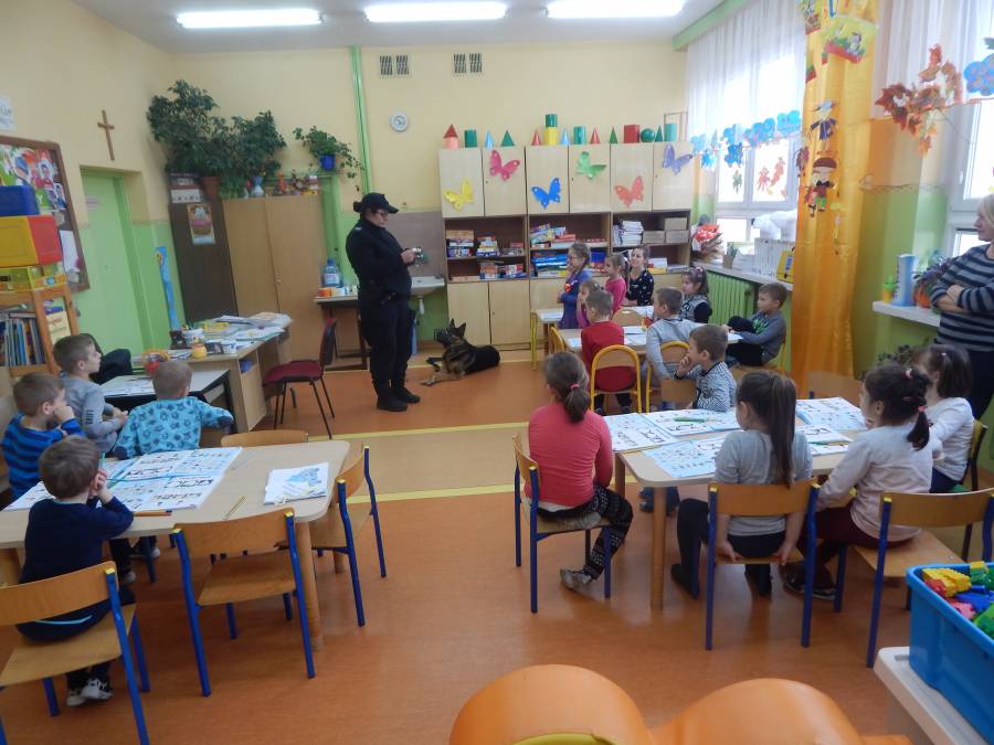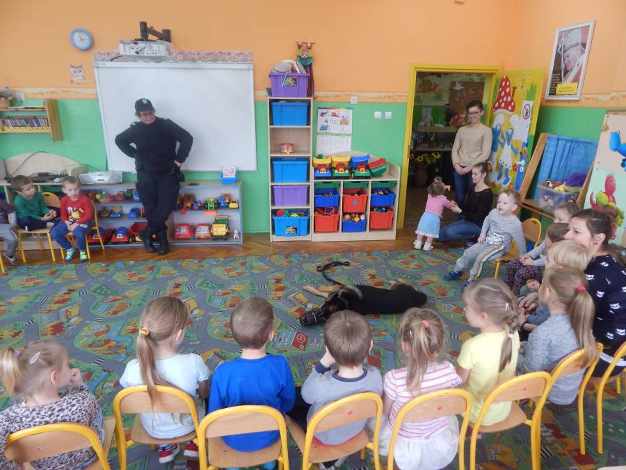 W dniu 16.11.2017 r. w naszym przedszkolu odbyło się niezwykłe spotkanie z panią policjantką sierżantem sztabowym Iwoną Czajkowską z Komendy Powiatowej Policji w Sępólnie Krajeńskim i Reksem czyli psem patrolowo -tropiącym, którym pani Iwona się opiekuje. Podczas spotkania przedszkolacy dowiedzieli się o tym jak bezpiecznie poruszać się po drogach, podróżować samochodem, bawić w domu i w przedszkolu, oraz jak reagować w sytuacji innych zagrożeń, np. zasłabnięcie kogoś bliskiego, pożaru itp.. Pani Iwona ostrzegała również przed osobami nieznajomymi, z którymi nie wolno rozmawiać, brać od nich czegokolwiek ani wpuszczać ich do domu. Dzieci poznały zasady obchodzenia się z obcym, nierzadko agresywnym psem, ćwiczyły  postawę jaką powinny przyjąć podczas spotkania z takim zwierzakiem, dowiedziały się jakie zadanie ma do spełnienia pies policyjny patrolowo - tropiący na służbie. Reksio, który podczas całego spotkania był bardzo posłuszny swojej pani przewodnik, na zakończenie zaprezentował  swoje umiejętności. Przedszkolaki zadawały mnóstwo pytań i czynnie uczestniczyły w spotkaniu, które odbyło się dzięki uprzejmości Inspektora Pawła Zawady z Komendy Powiatowej Policji w Sępólnie Krajeńskim.