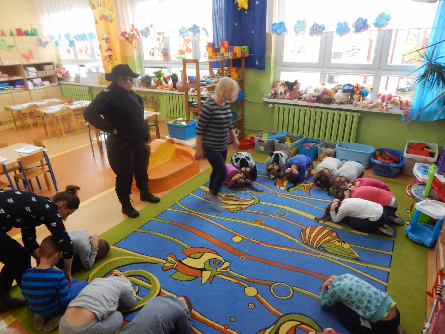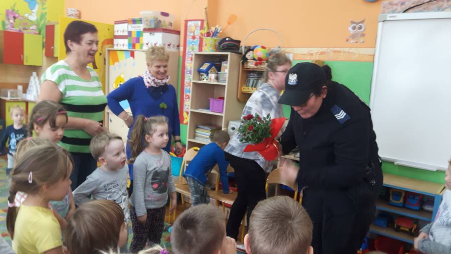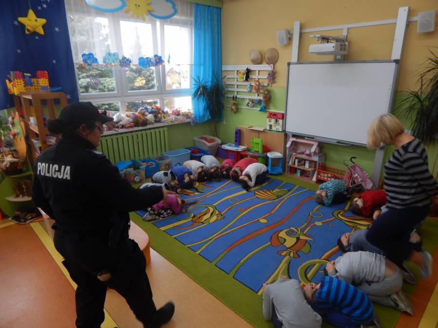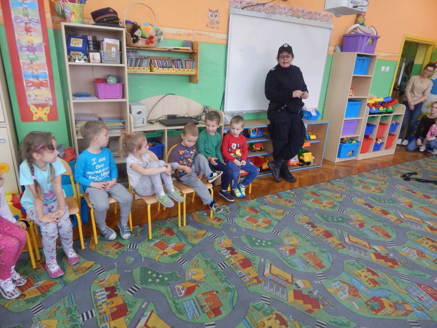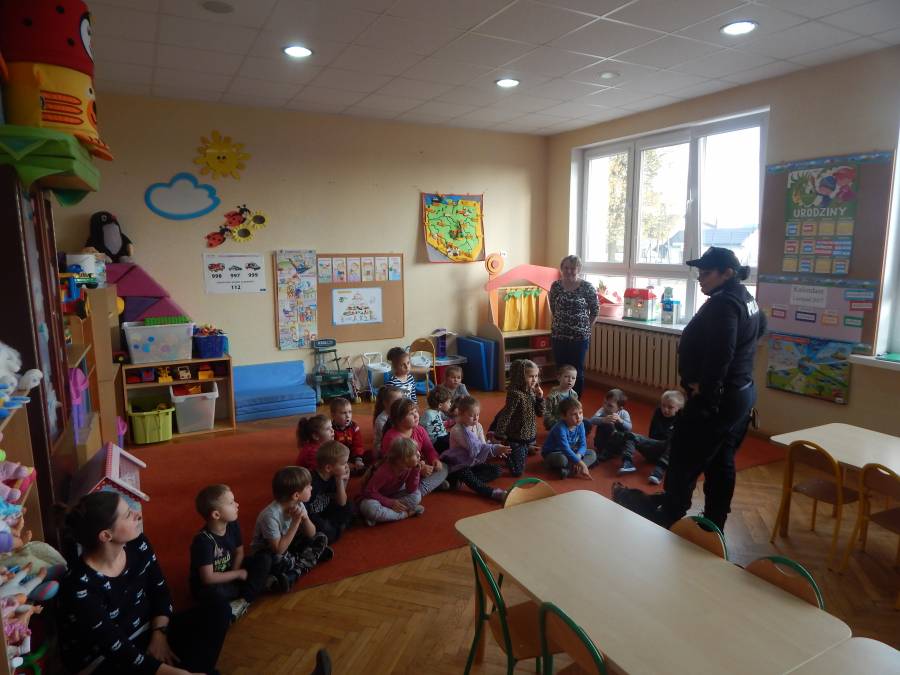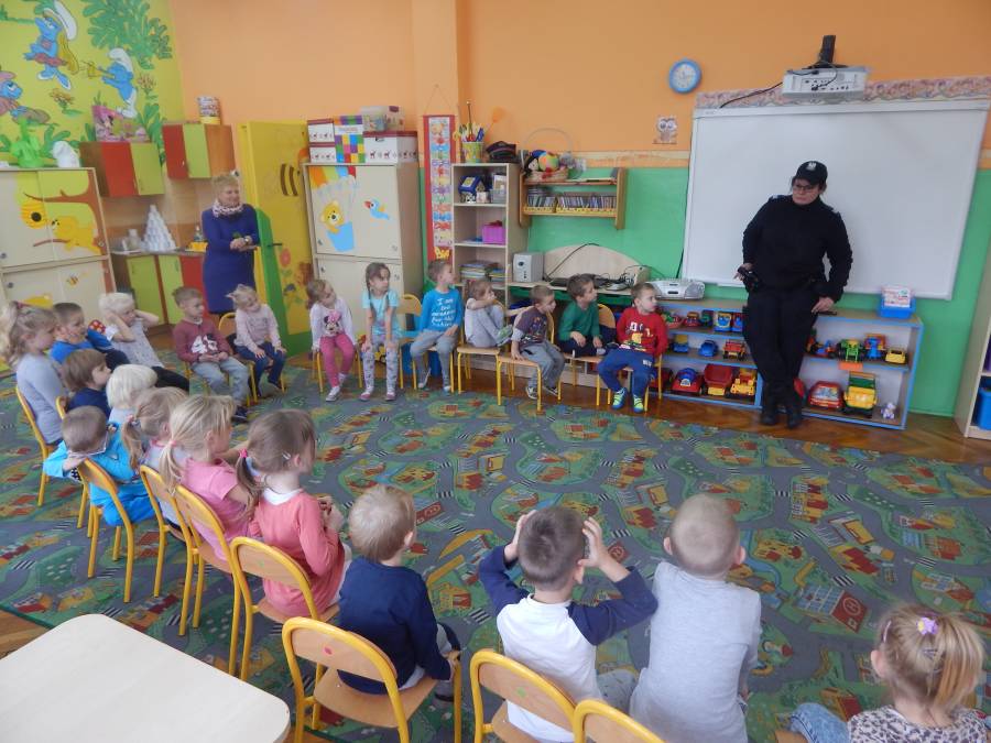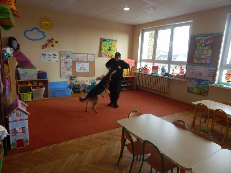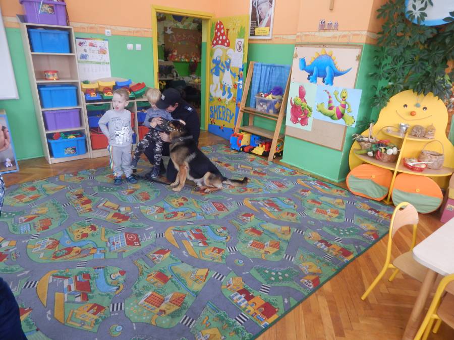 W dniu 16.11.2017 r. w naszym przedszkolu odbyło się niezwykłe spotkanie z panią policjantką sierżantem sztabowym Iwoną Czajkowską z Komendy Powiatowej Policji w Sępólnie Krajeńskim i Reksem czyli psem patrolowo -tropiącym, którym pani Iwona się opiekuje. Podczas spotkania przedszkolacy dowiedzieli się o tym jak bezpiecznie poruszać się po drogach, podróżować samochodem, bawić w domu i w przedszkolu, oraz jak reagować w sytuacji innych zagrożeń, np. zasłabnięcie kogoś bliskiego, pożaru itp.. Pani Iwona ostrzegała również przed osobami nieznajomymi, z którymi nie wolno rozmawiać, brać od nich czegokolwiek ani wpuszczać ich do domu. Dzieci poznały zasady obchodzenia się z obcym, nierzadko agresywnym psem, ćwiczyły  postawę jaką powinny przyjąć podczas spotkania z takim zwierzakiem, dowiedziały się jakie zadanie ma do spełnienia pies policyjny patrolowo - tropiący na służbie. Reksio, który podczas całego spotkania był bardzo posłuszny swojej pani przewodnik, na zakończenie zaprezentował  swoje umiejętności. Przedszkolaki zadawały mnóstwo pytań i czynnie uczestniczyły w spotkaniu, które odbyło się dzięki uprzejmości Inspektora Pawła Zawady z Komendy Powiatowej Policji w Sępólnie Krajeńskim.