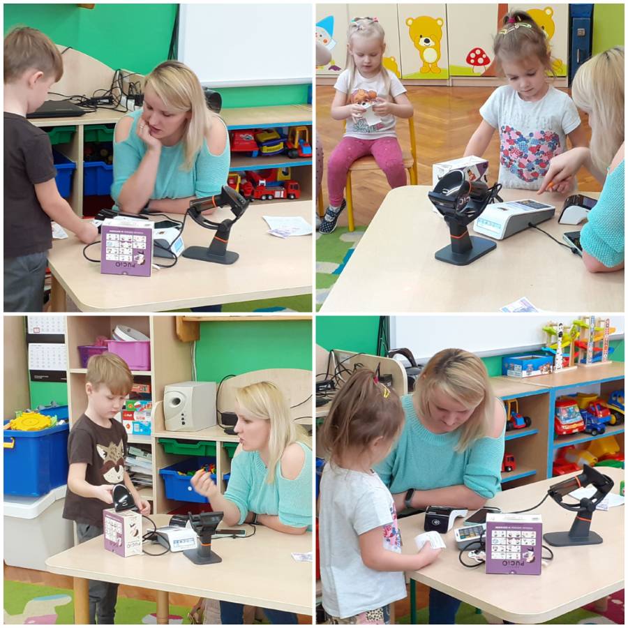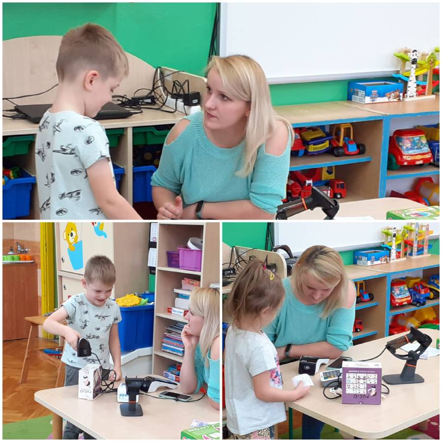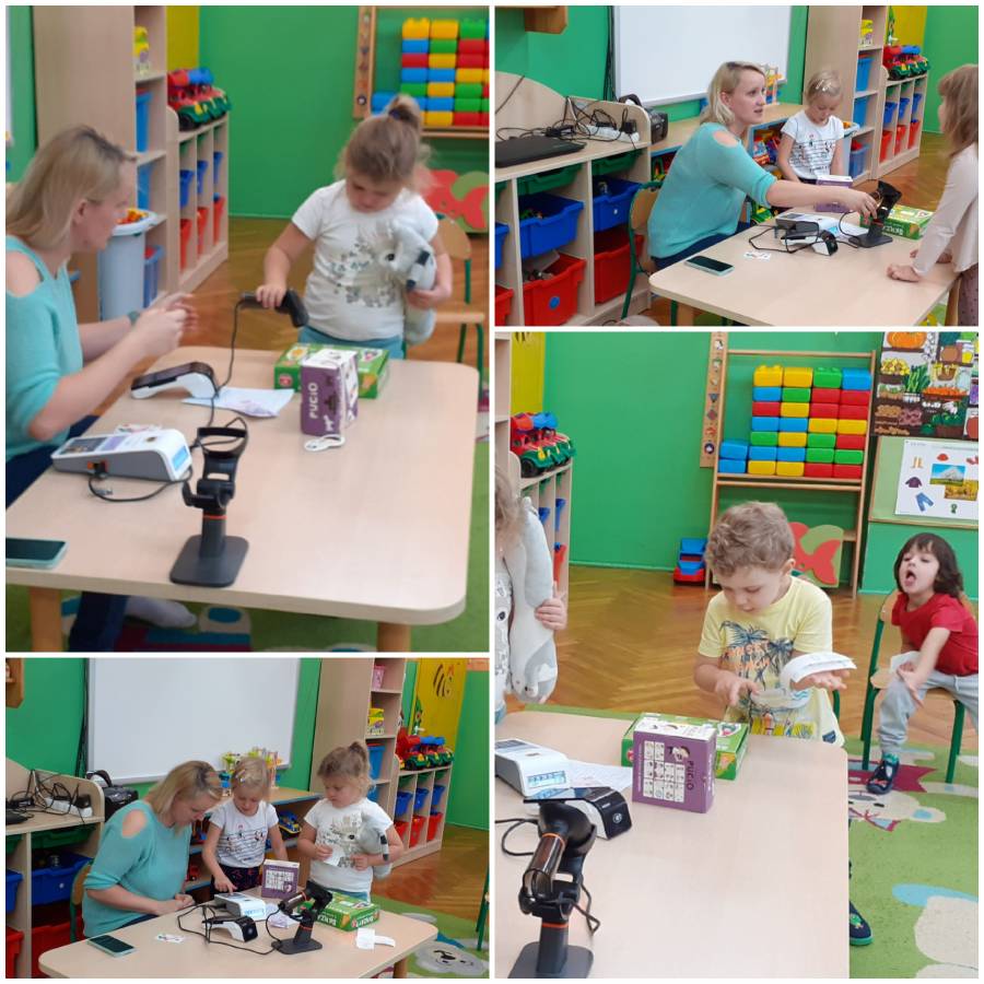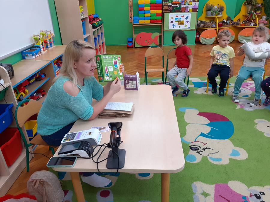 Dzieci z grupy Smerfy odwiedziła Pani Kamila Nowacka, mama Antosi i przybliżła w bardzo ciekawy sposób zawód sprzedawcy????. Dzieci miały okazję skanować kody kreskowe i robić zakupy płacąc kartą. Poznaliśmy również drogę towaru jaką pokonuje od producenta do klienta.