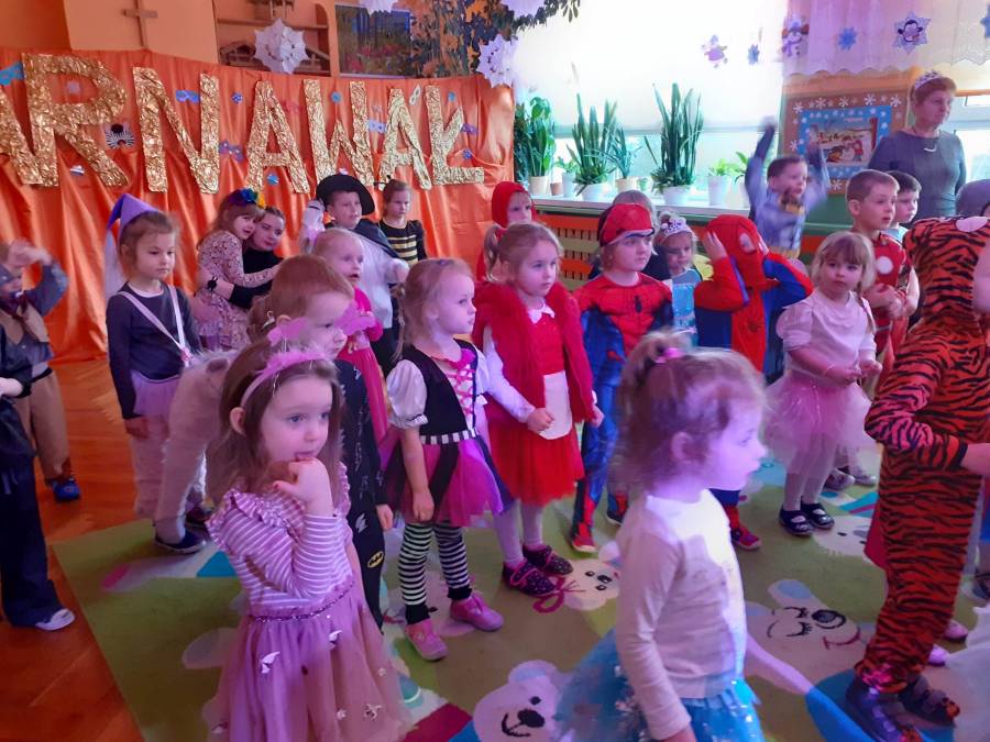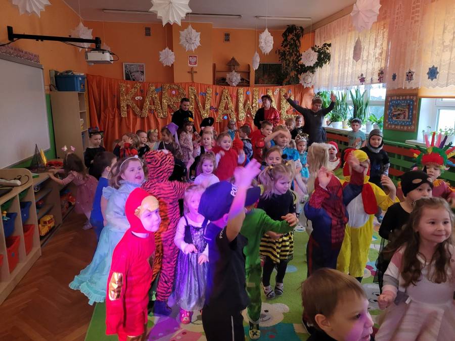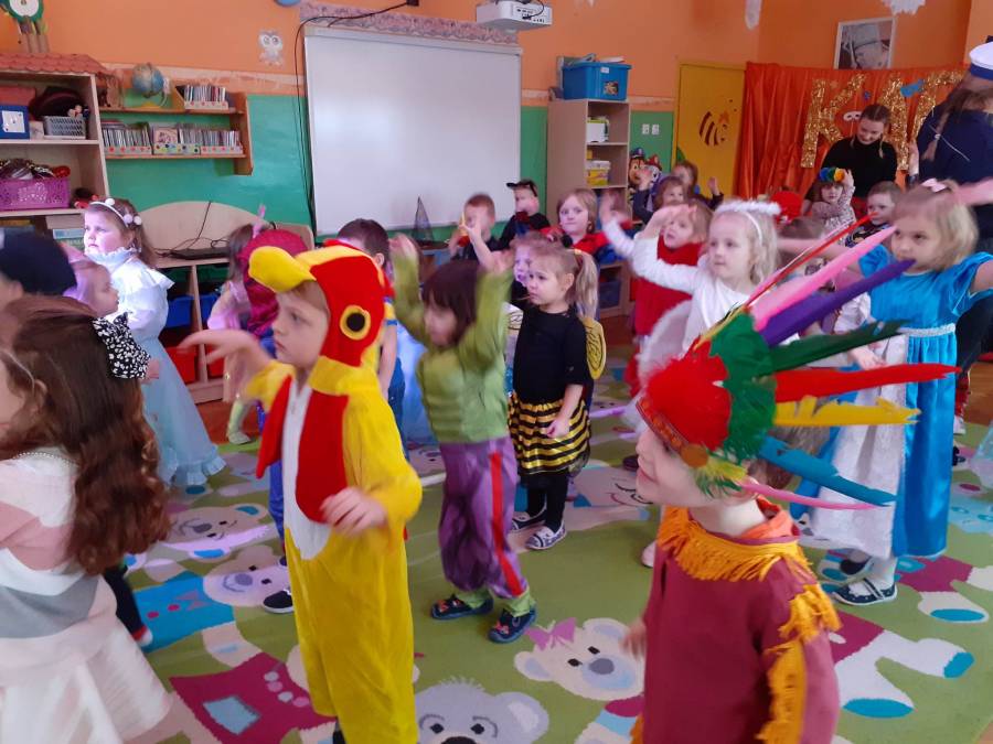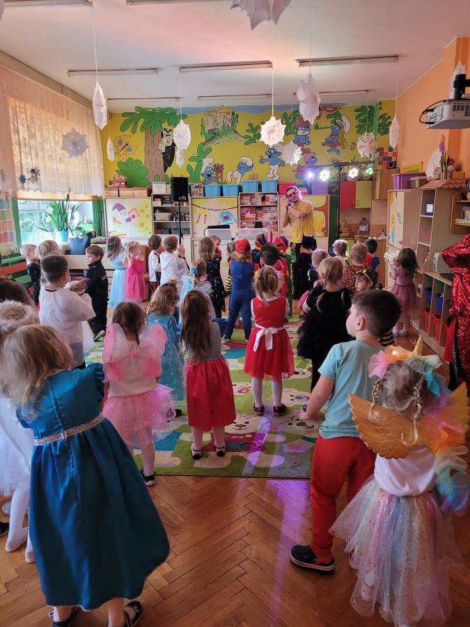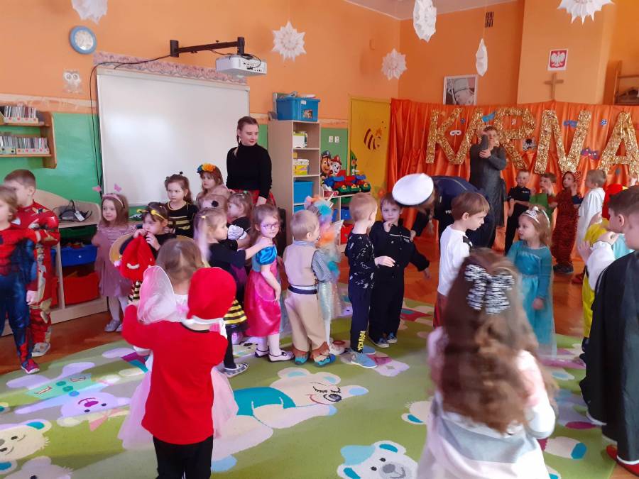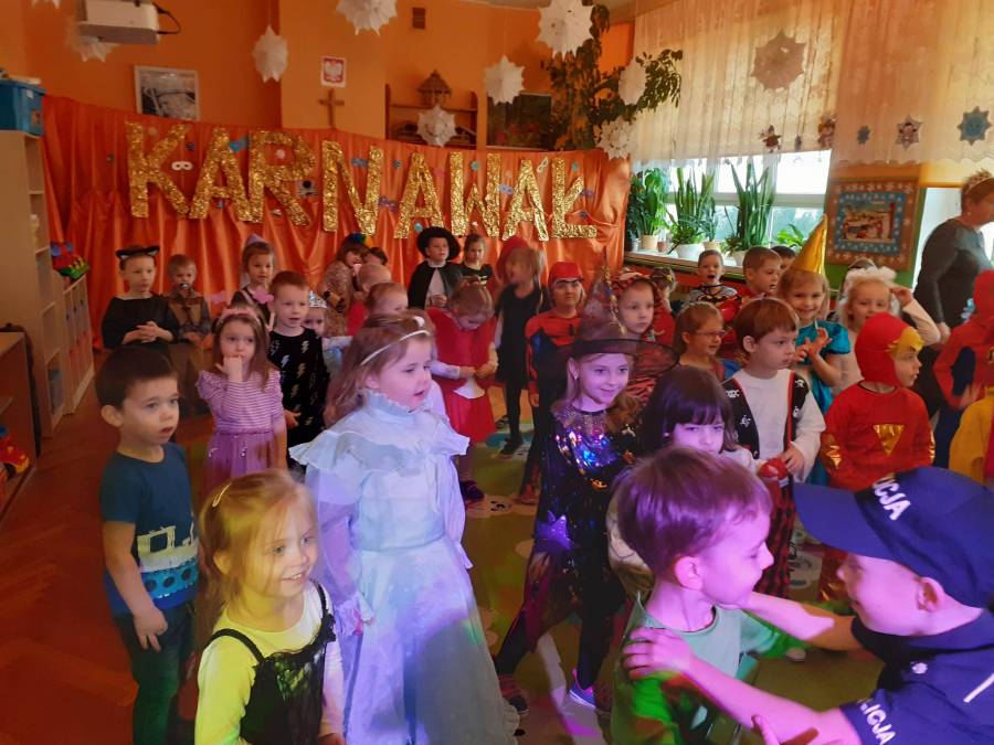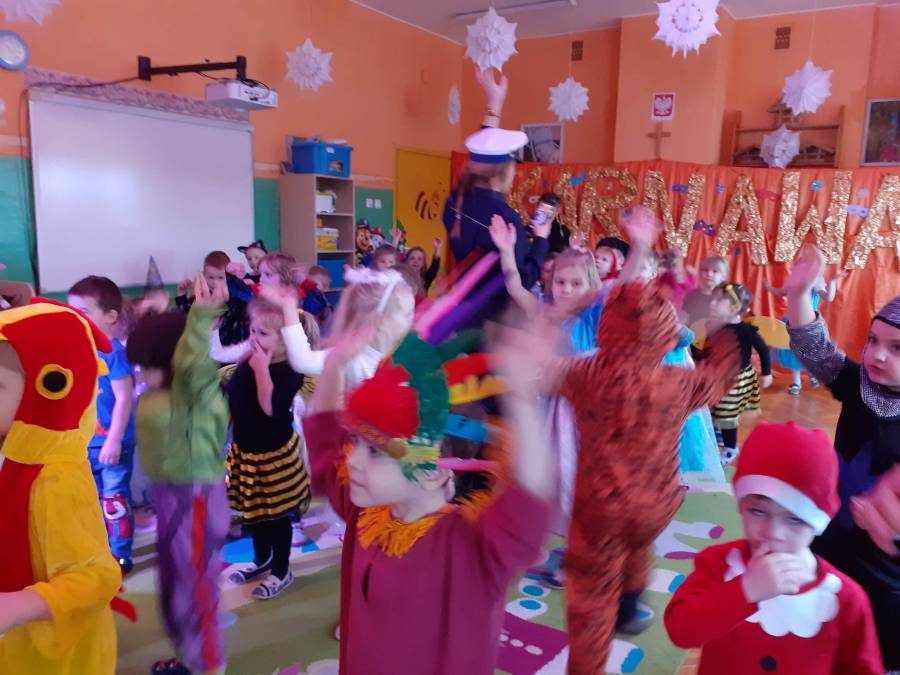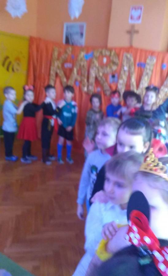 Karnawał w przedszkolu -stroimy więc sale.Ma być w nich bajkowo,przytulnie, wspaniale.Są zwoje serpentyn,wieszamy lampiony,gwiazdeczki błyszczącei barwne balony.Pląsamy po sali,to świetna zabawa.Są stroje bajkowe,niech żyje karnawał.Zabawne konkursy,występy artystów,zagadki i nowychtysiące pomysłów.Wesołą zabawęwodzirej prowadzi.Jak tańczyć każdemuna pewno doradzi.Zabawa w przedszkolu,wesoła zabawa.Niech trwa jak najdłużejwspaniały karnawał.
