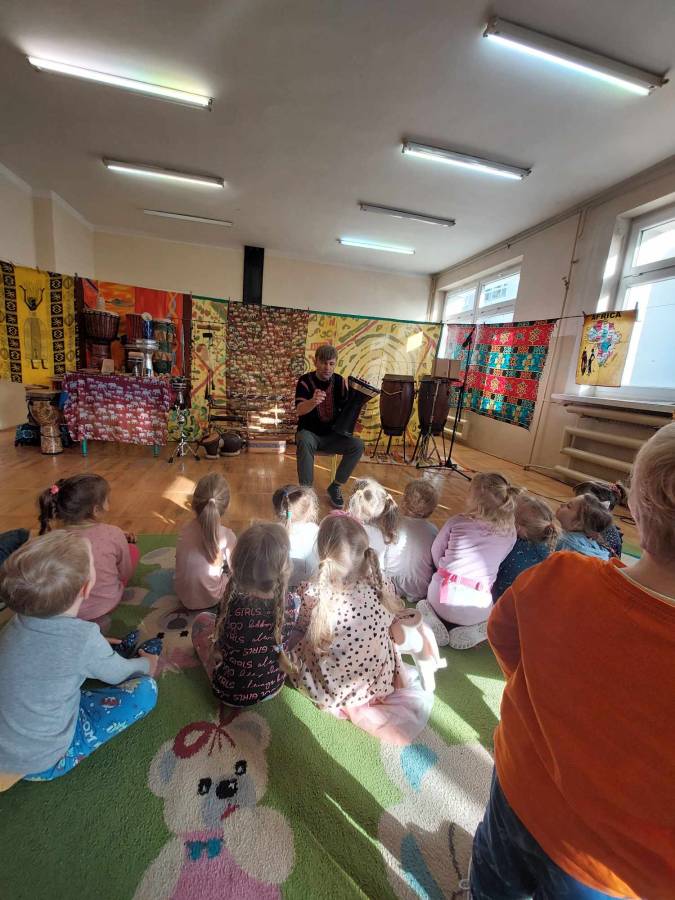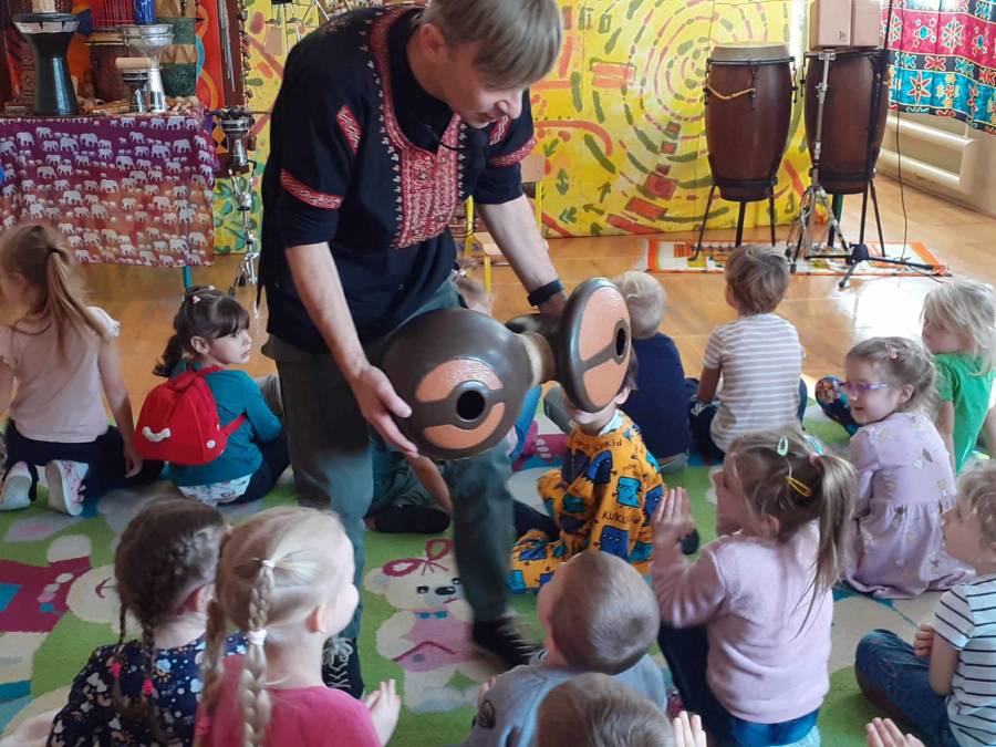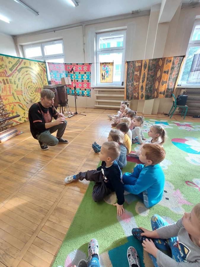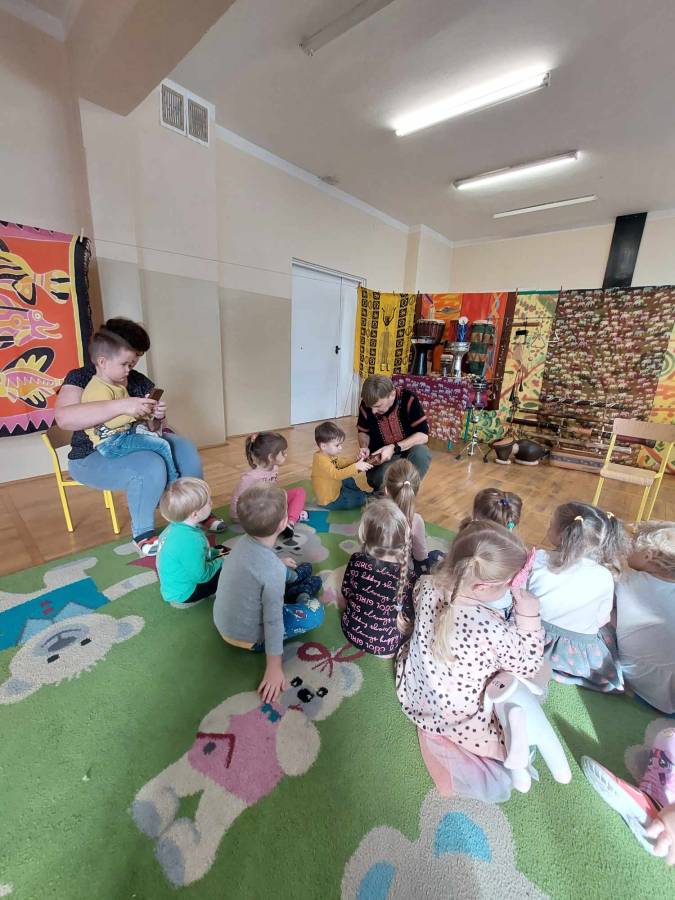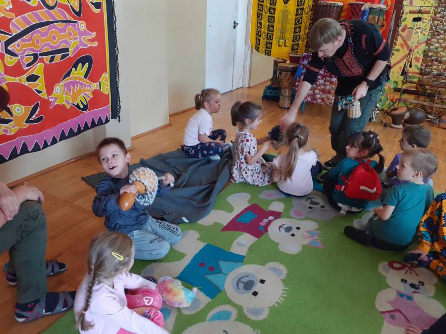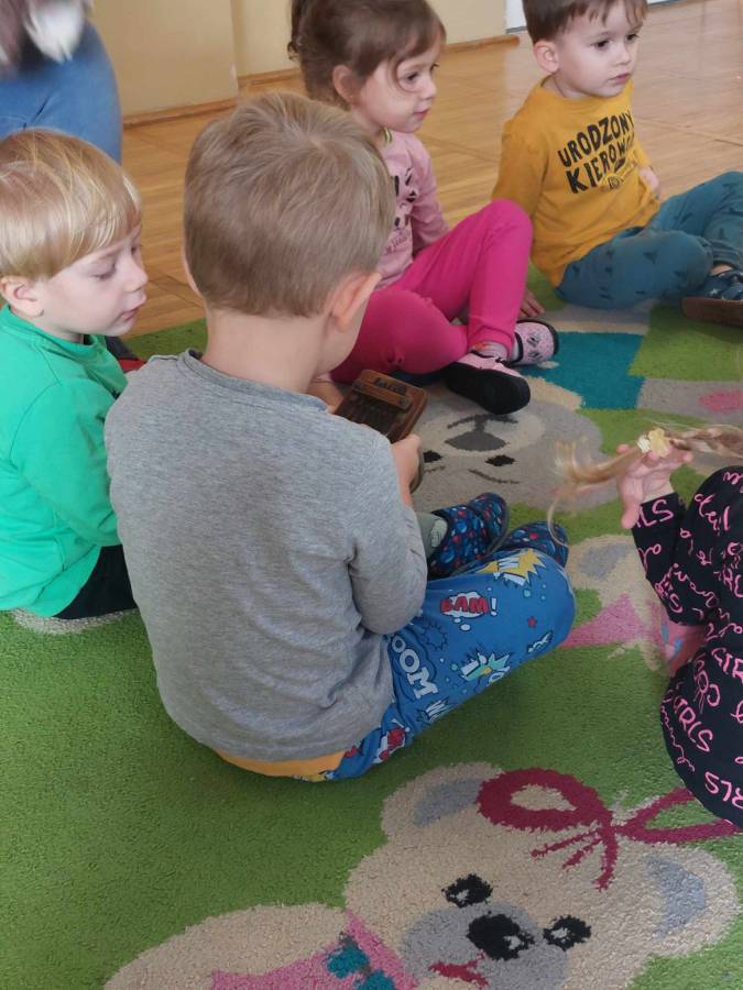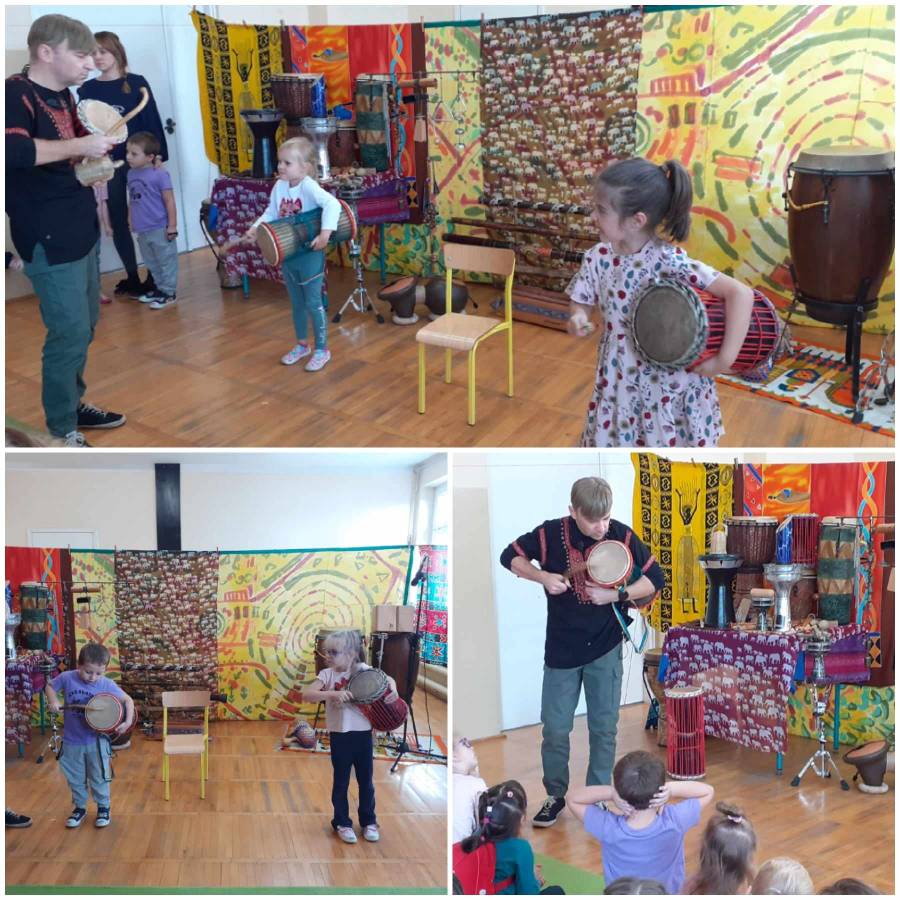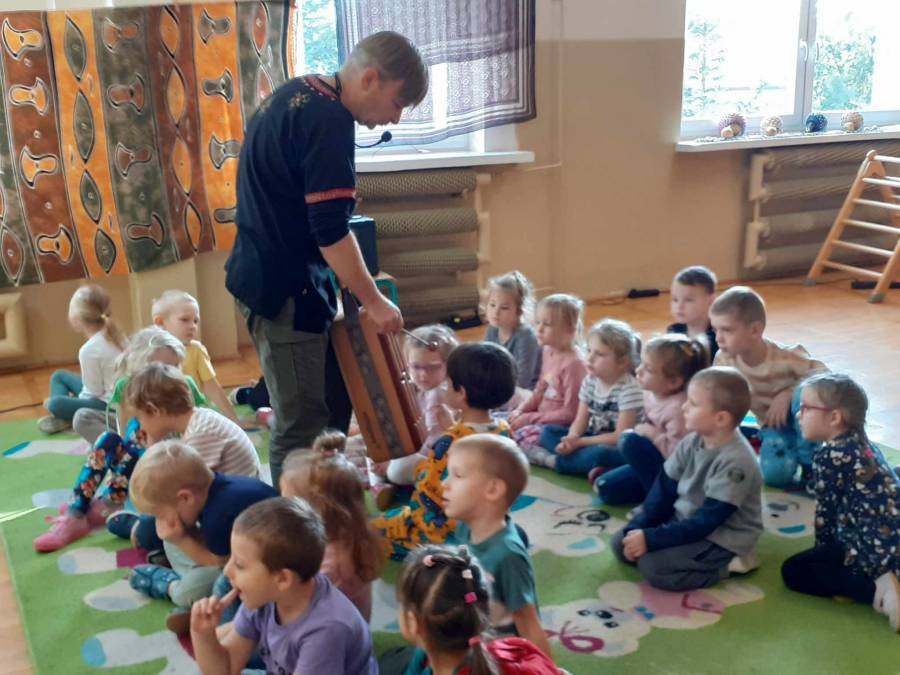 Już kolejny raz mieliśmy okazję bawić się muzyką, rytmem, dźwiękami, wykorzystując instrumenty etniczne, które zaprezentował nam pan Sławomir Głowala ze Świecia. Słuchając dźwięku instrumentów dzieci przeniosły się w wyobraźni do lasu. Niezwykle radosnym i  ciekawym doświadczeniem była samodzielna gra na tych instrumentach.