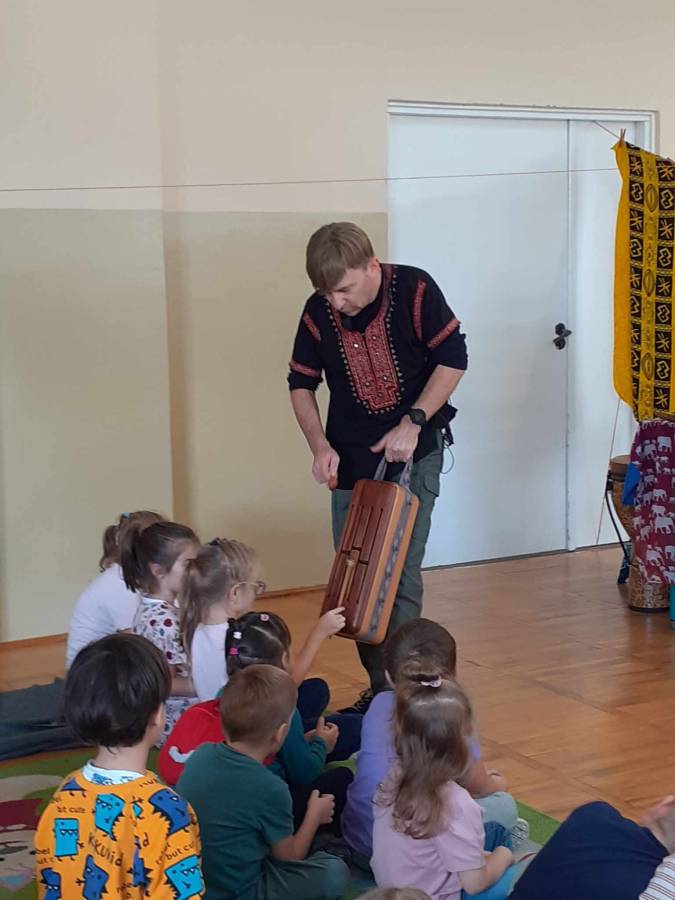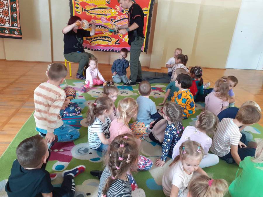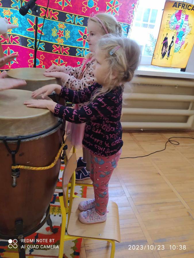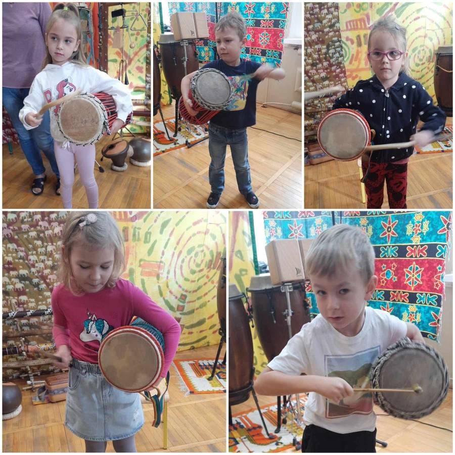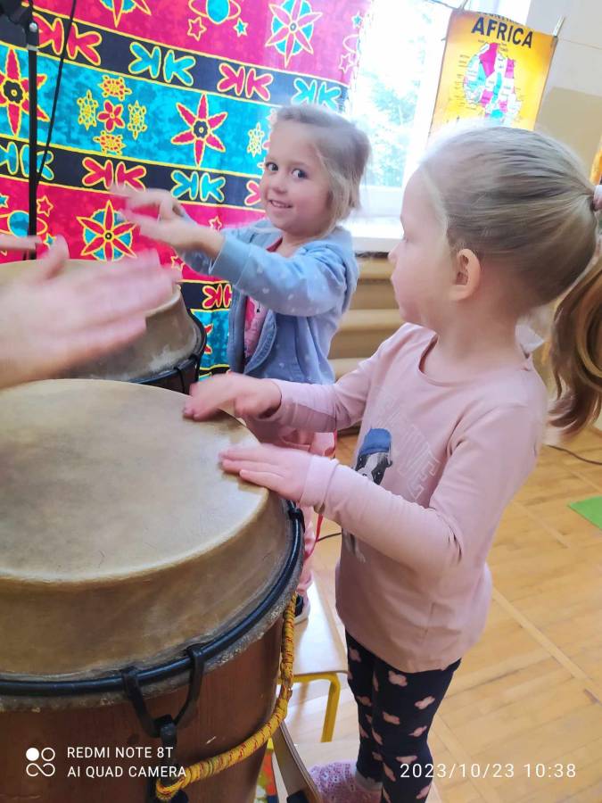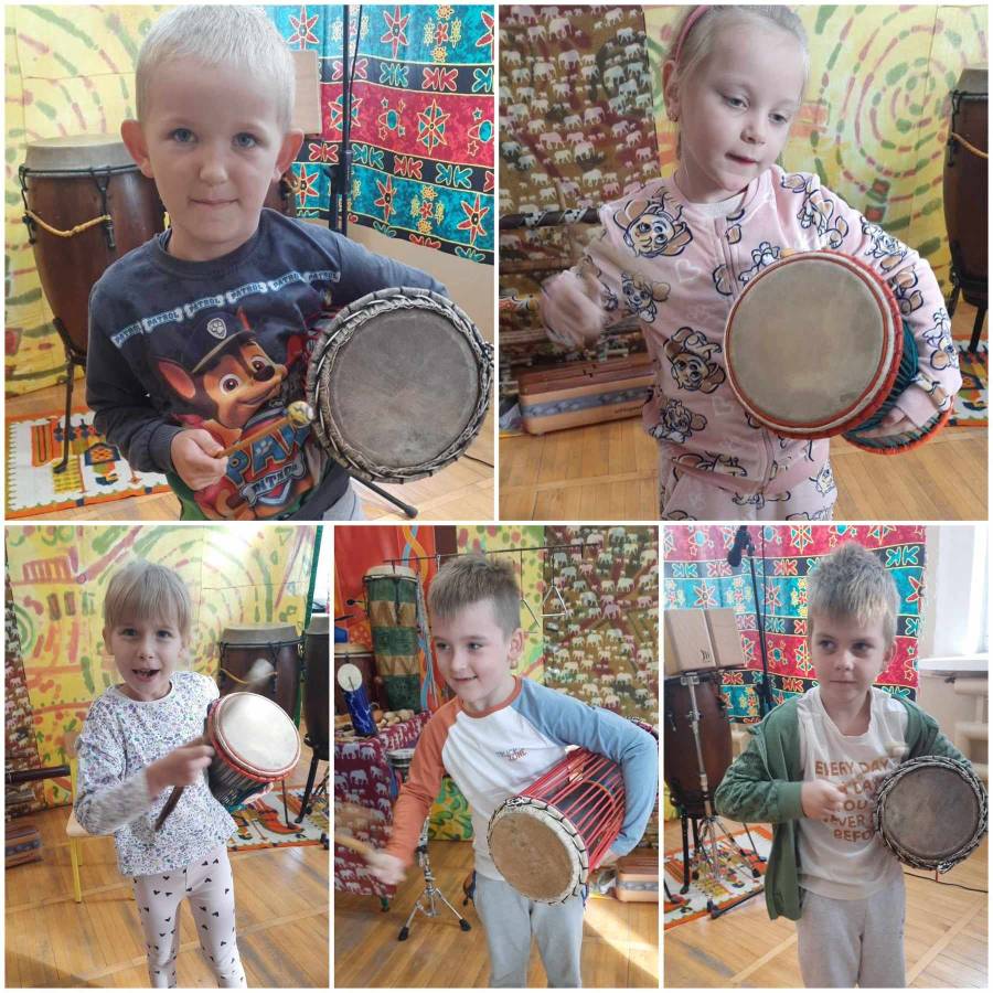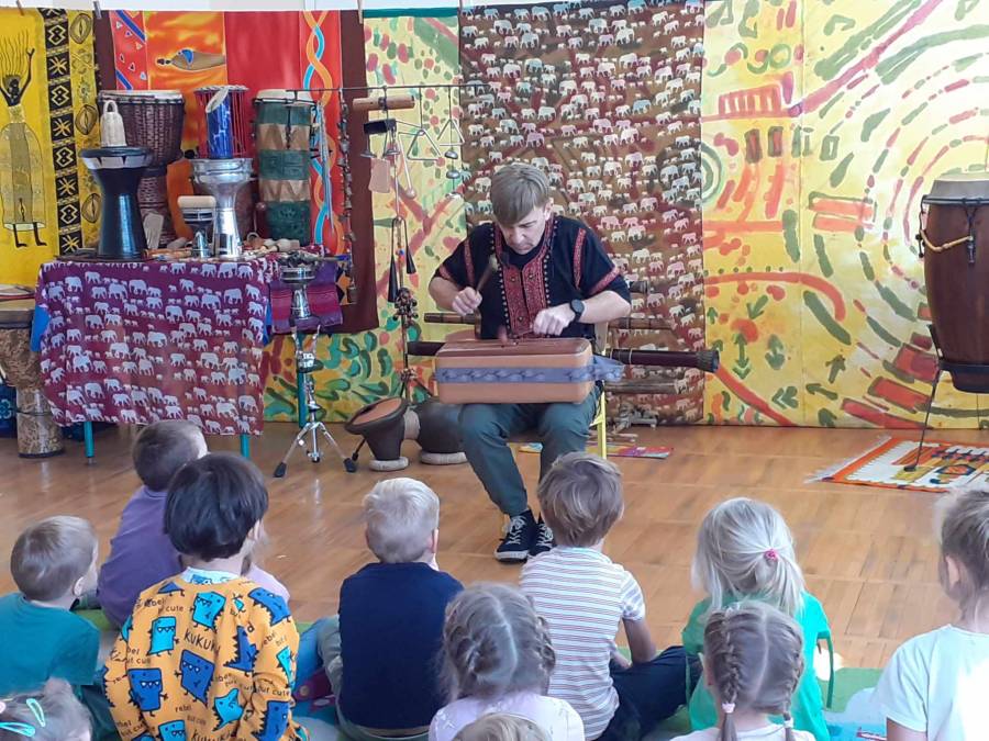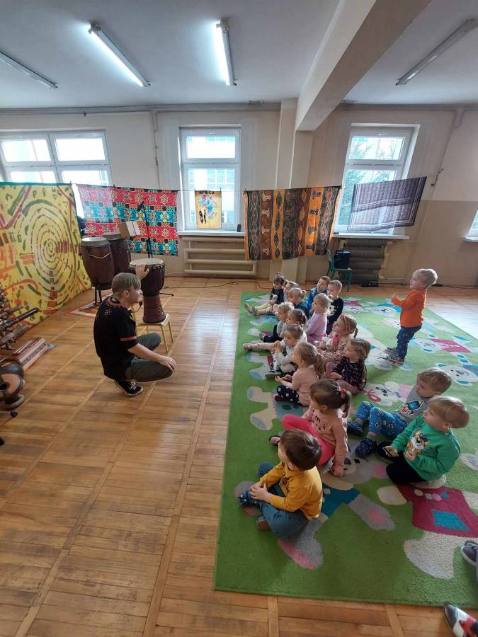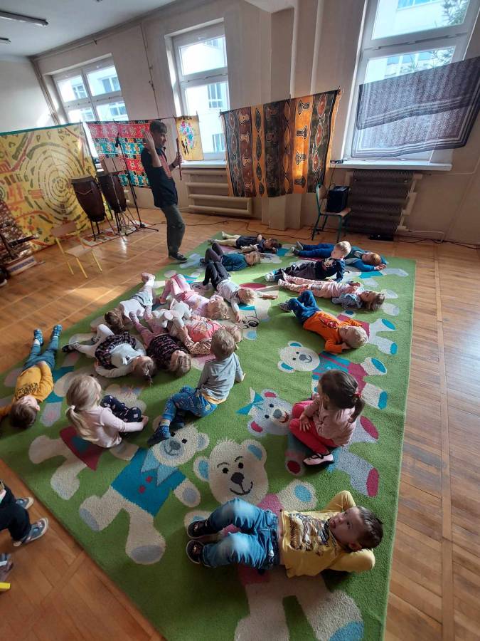 Już kolejny raz mieliśmy okazję bawić się muzyką, rytmem, dźwiękami, wykorzystując instrumenty etniczne, które zaprezentował nam pan Sławomir Głowala ze Świecia. Słuchając dźwięku instrumentów dzieci przeniosły się w wyobraźni do lasu. Niezwykle radosnym i  ciekawym doświadczeniem była samodzielna gra na tych instrumentach.