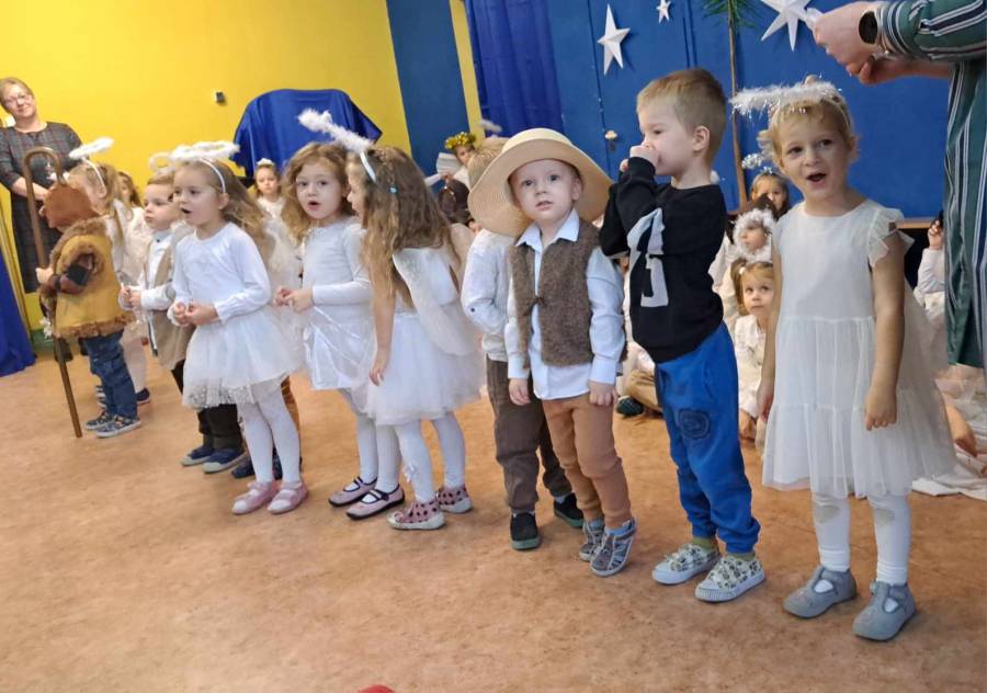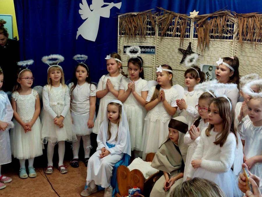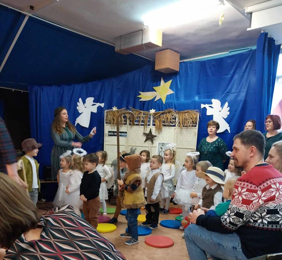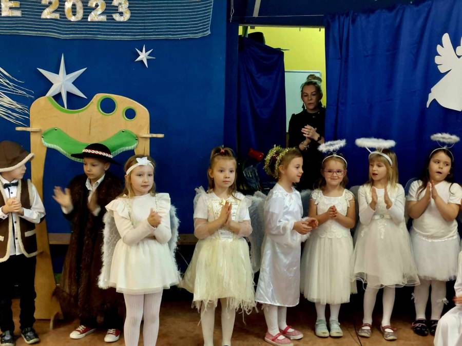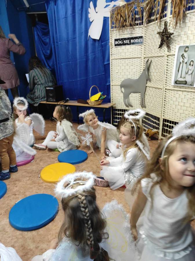 Występami jasełkowymi zakończyliśmy czas przygotowań do świąt Bożego Narodzenia w przedszkolu. Dzieci w rolach aniołków, pastuszków, królów i Świętej Rodziny recytowały świąteczne wiersze i śpiewały piosenki oraz znane kolędy wspólnie z rodzicami i zaproszonymi gośćmi, którzy zaszczycili nas swoją obecnością i nagrodzili występy oklaskami.