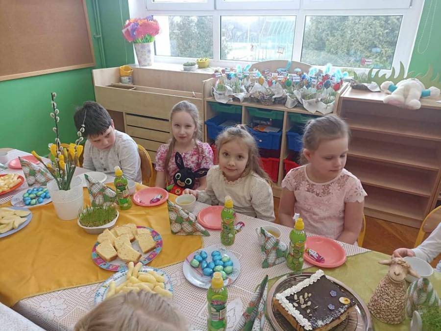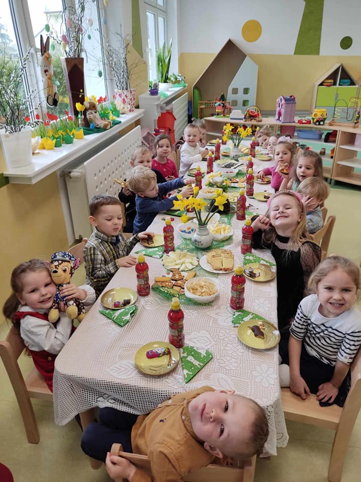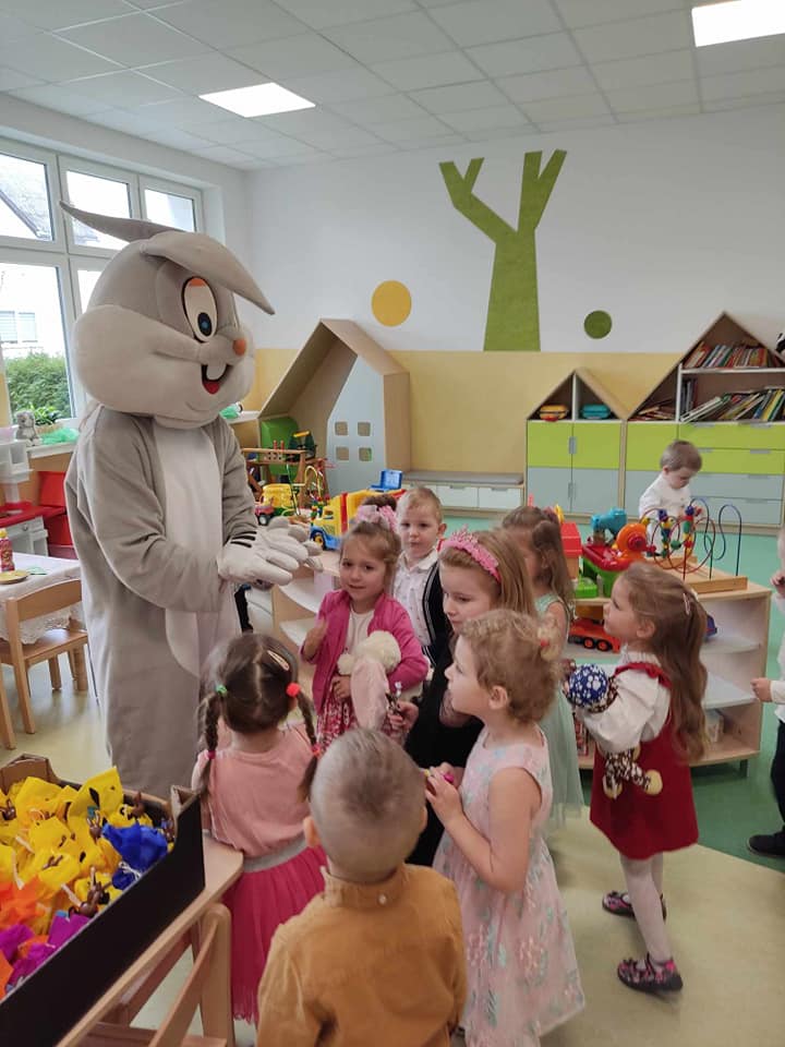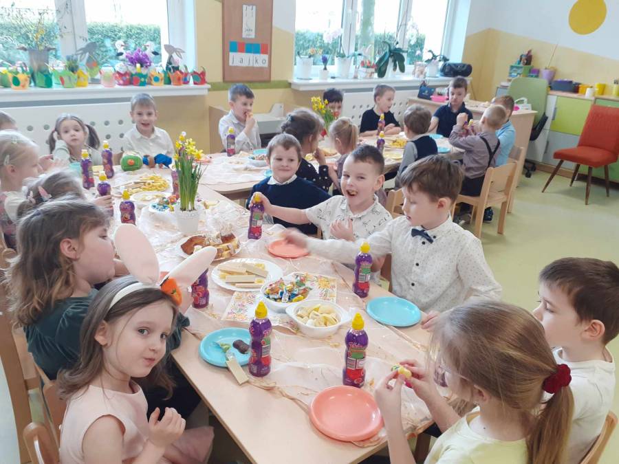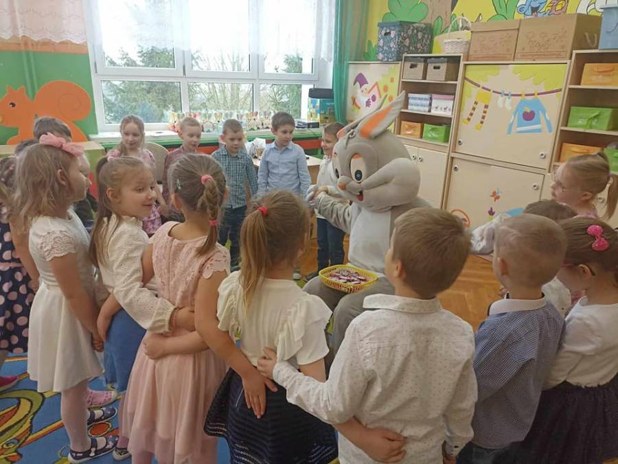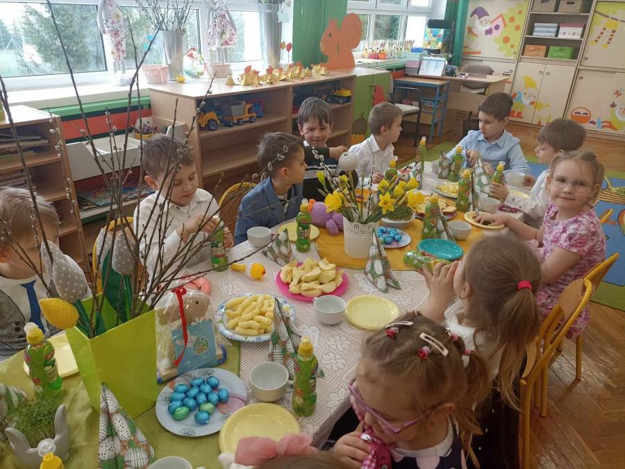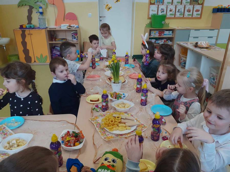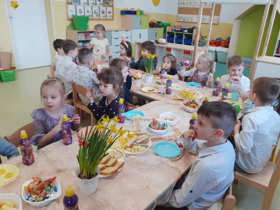We wtorek 26 marca w naszym przedszkolu odbyło się uroczyste śniadanie wielkanocne, które zostało rozpoczęte wspólnym składaniem sobie życzeń świątecznych. Ten dzień miał wyjątkowy charakter -dzieci śpiewały piosenki świąteczne i bawiły się w zabawy związane z tradycjami wielkanocnymi. Po śniadaniu wszystkie grupy odwiedził Wielkanocny Zajączek, który poczęstował dzieci słodyczami i zostawił upominki. Wielkanocne świętowanie sprawiło dzieciom wiele radości.
