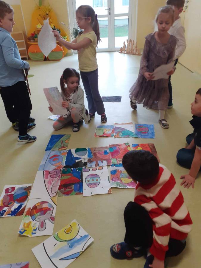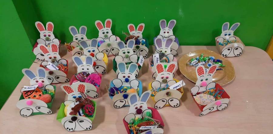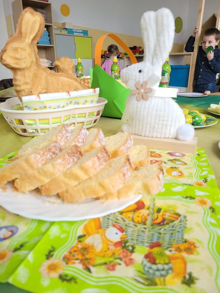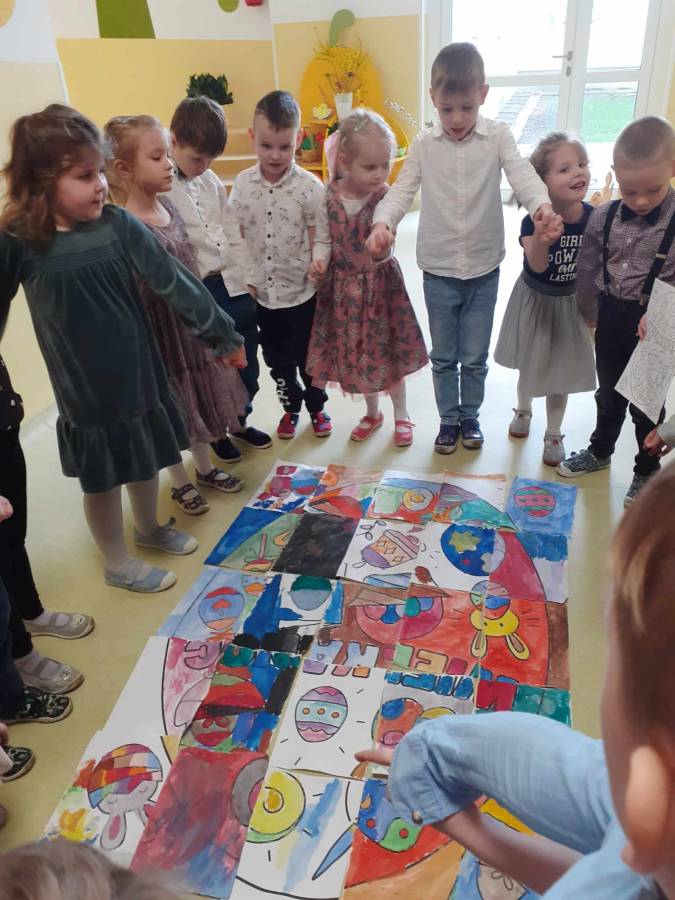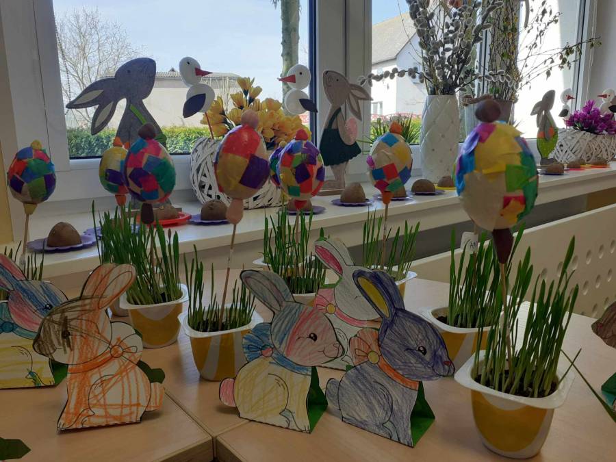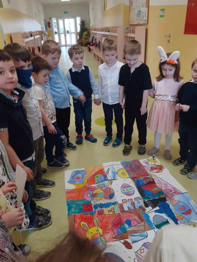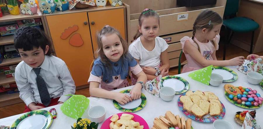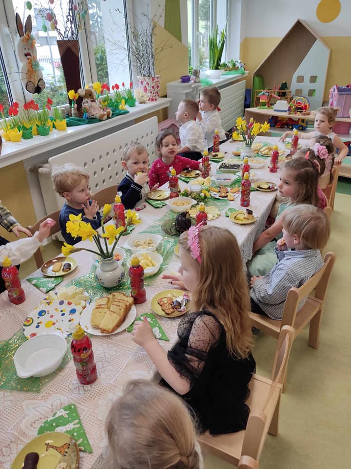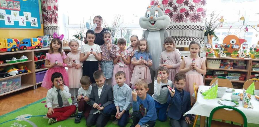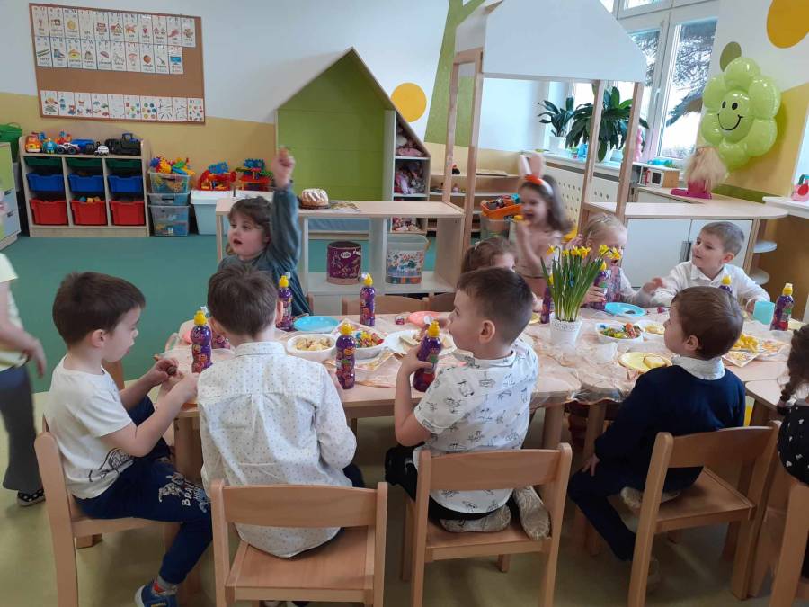 We wtorek 26 marca w naszym przedszkolu odbyło się uroczyste śniadanie wielkanocne, które zostało rozpoczęte wspólnym składaniem sobie życzeń świątecznych. Ten dzień miał wyjątkowy charakter -dzieci śpiewały piosenki świąteczne i bawiły się w zabawy związane z tradycjami wielkanocnymi. Po śniadaniu wszystkie grupy odwiedził Wielkanocny Zajączek, który poczęstował dzieci słodyczami i zostawił upominki. Wielkanocne świętowanie sprawiło dzieciom wiele radości.