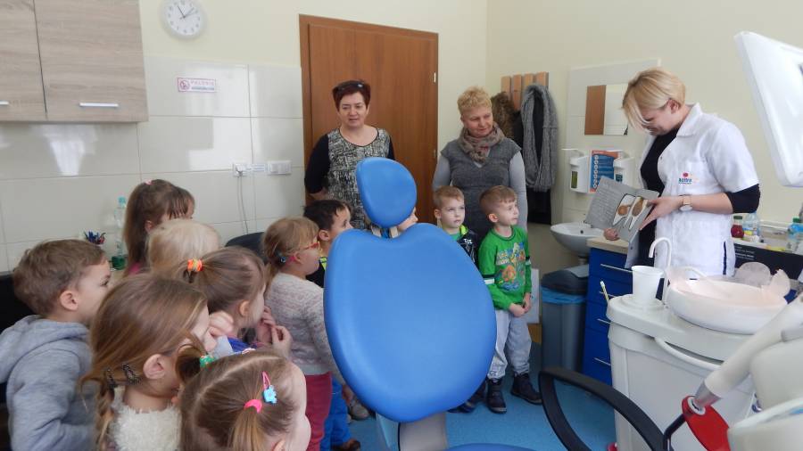 Przedszkolaki z grupy "Pszczółki" rozpoczęły cykl wizyt w gabinecie stomatologicznym mieszczącym się w Gminnym Ośrodku Zdrowia w Świekatowie.Celem wizyty była pogadanka na temat ważności i konieczności dbania o higienę jamy ustnej, przełamanie obaw przed wizytą u dentysty, a także kształtowanie nawyków prozdrowotnych. Przedszkolaki dowiedziały się o negatywnym wpływie próchnicy na zęby mleczne i na zęby stałe, wiedzą jakie pokarmy dobrze służą budowie zębów, a jakie je niszczą. Dzieci miały okazję zapoznać się ze specyfiką pracy dentysty oraz obejrzeć wygląd i wyposażenie gabinetu stomatologicznego. Dowiedziały się również jak dbać o zęby, by były zawsze piękne i zdrowe. Mamy nadzieję, że nasze przedszkolaki nie będą czuć lęku przed wizytą w gabinecie stomatologicznym. Bardzo dziękujemy za tak życzliwe przyjęcie.