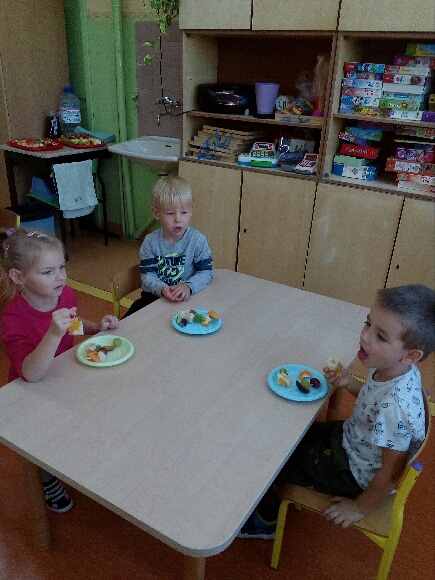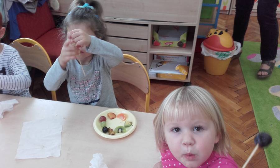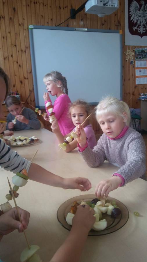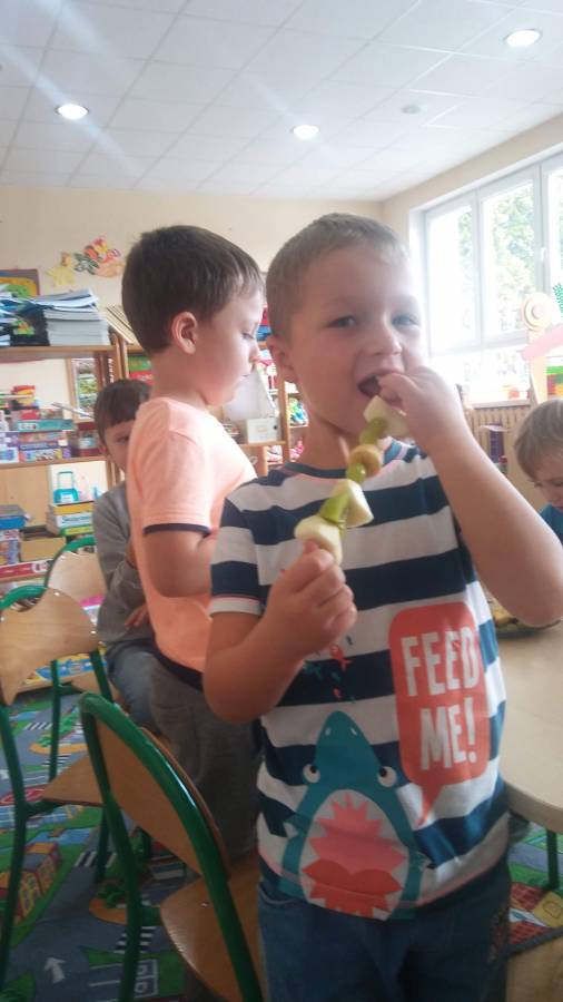 Kolorowa jesień zawitała do naszego przedszkola. Podczas zajęć dzieci wzbogacały i utrwalały wiedzę na temat różnych owoców i warzyw oraz ich walorów zdrowotnych. Dzieci w grupach Motylki, Biedronki, Pszczółki i Smerfy przygotowywały smakowite szaszłyki owocowe. Wszystkie przedszkolaki chętnie spożywały własnoręcznie przygotowane smakołyki.