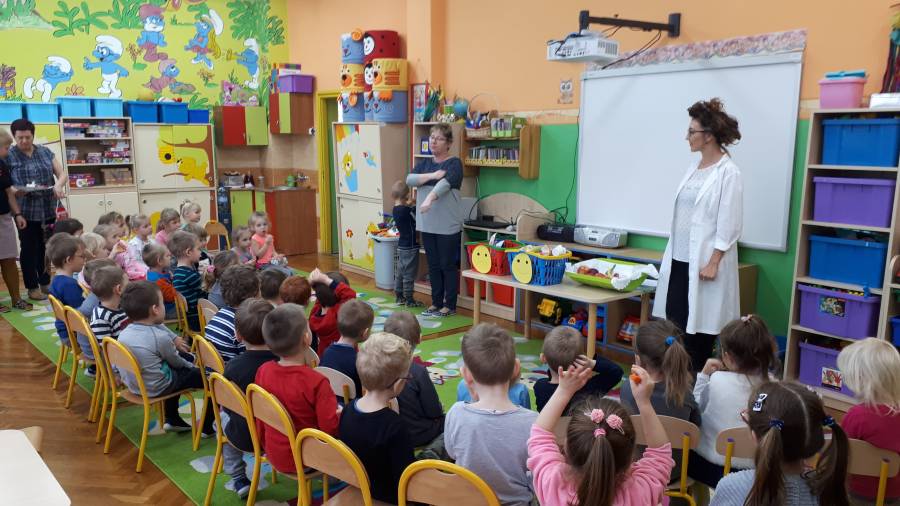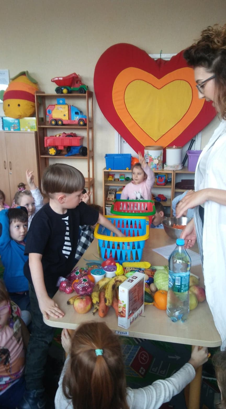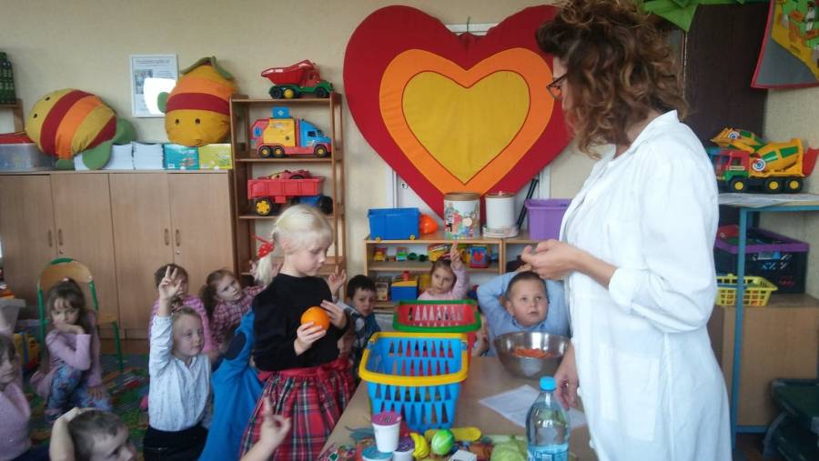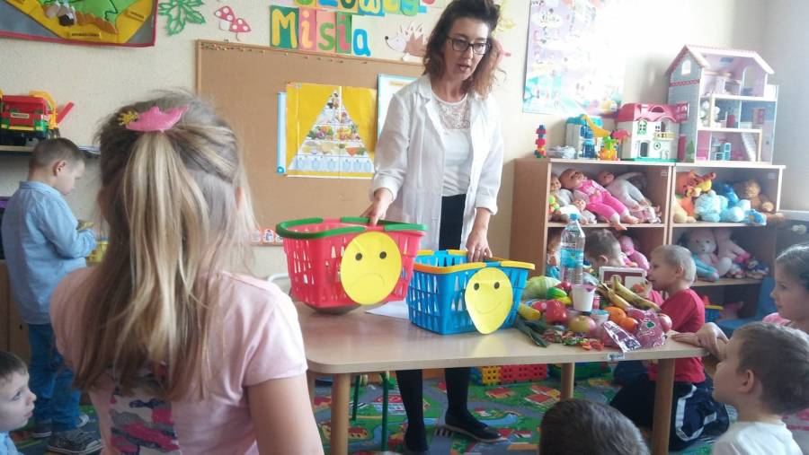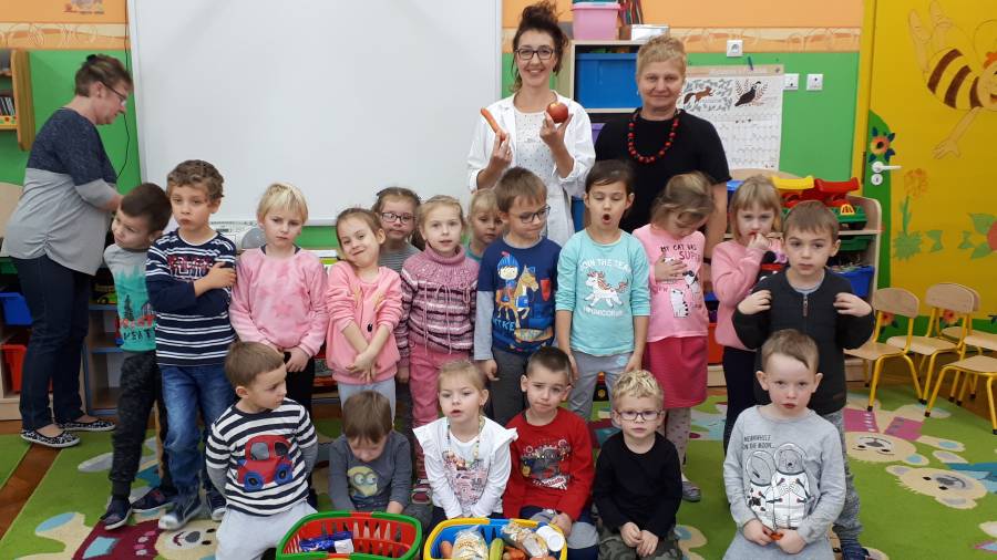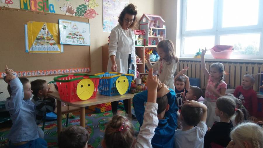 Podczas tygodnia "Dbamy o zdrowie" przedszkolaki poznawały zasady zdrowego trybu zycia. Dowiedziały się, że na nasze zdrowie ma wpływ wiele czynników: gimnastyka, spacery na swieżym powietrzu, odpoczynek, higiena osobista i zdrowe odżywianie. Sporo naszych przedszkolaków jest niejadkami dlatego zaprosiliśmy do przedszkola panią Martę Welter, która jest dietetykiem i opowiedziała dzieciom jak ważne dla naszego zdrowia jest odżywianie. Omawiała produkty żywnościowe na kolejnych piętrach piramidy żywieniowej - od tych najzdowszych i najbardziej wartosciowych po te, które w odżywianiu powinny się znaleźć w niewielkich ilościach. Na koniec dzieci brały udział w quizie i same decydowały, który produkt jest zdrowy a który nie umieszczając go w odpowiednim koszyku. Po spotkaniu dzieci zorganizowały poczęstunek ze zdrowych produktów. Spotkanie było bardzo interesujace i ciekawe. Bardzo dziękujemy pani Marcie za przybycie do naszego przedszkola.