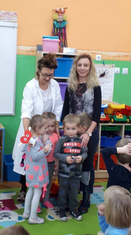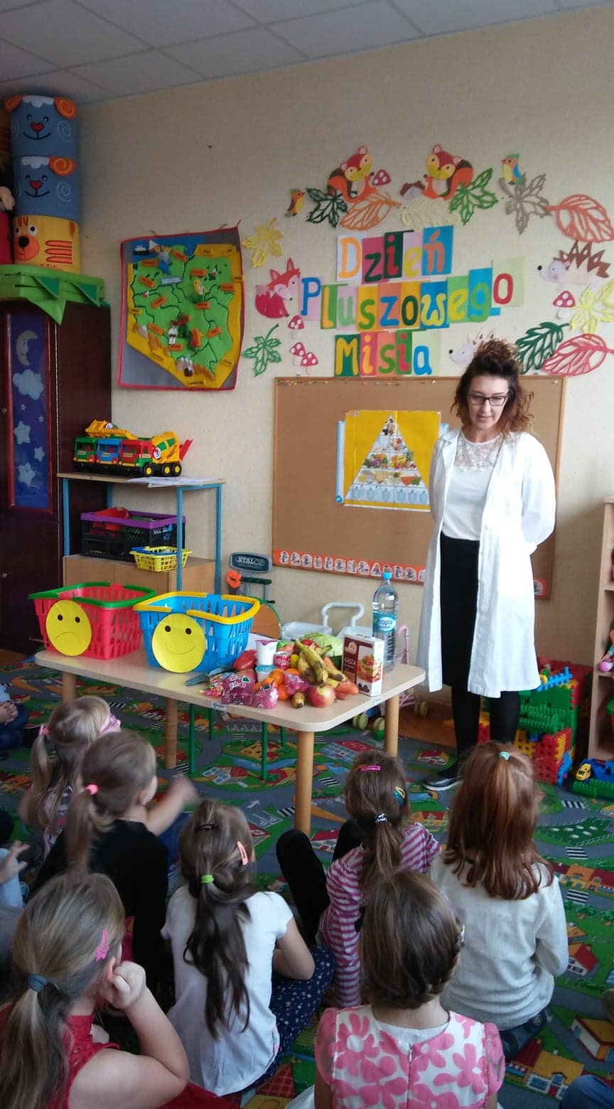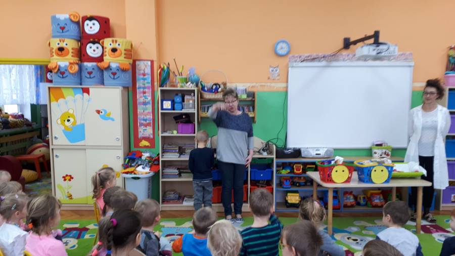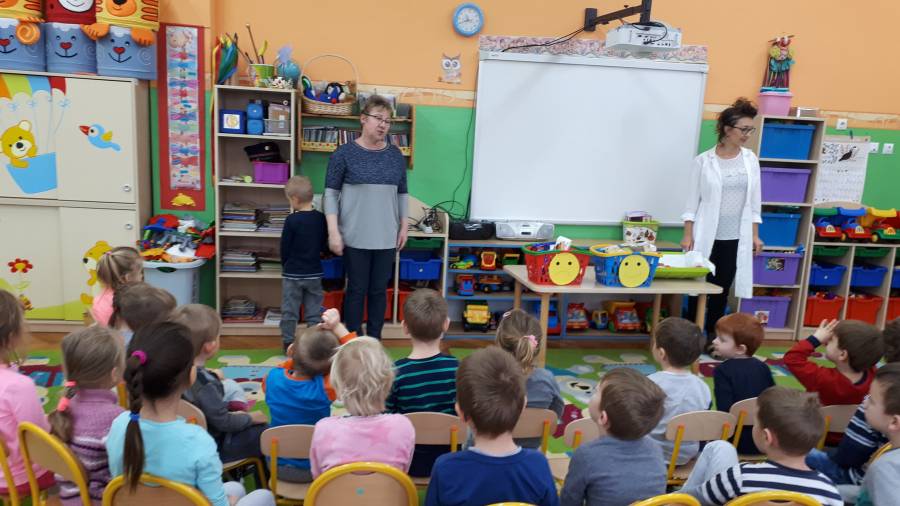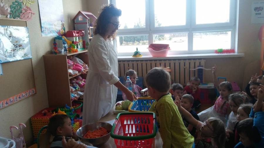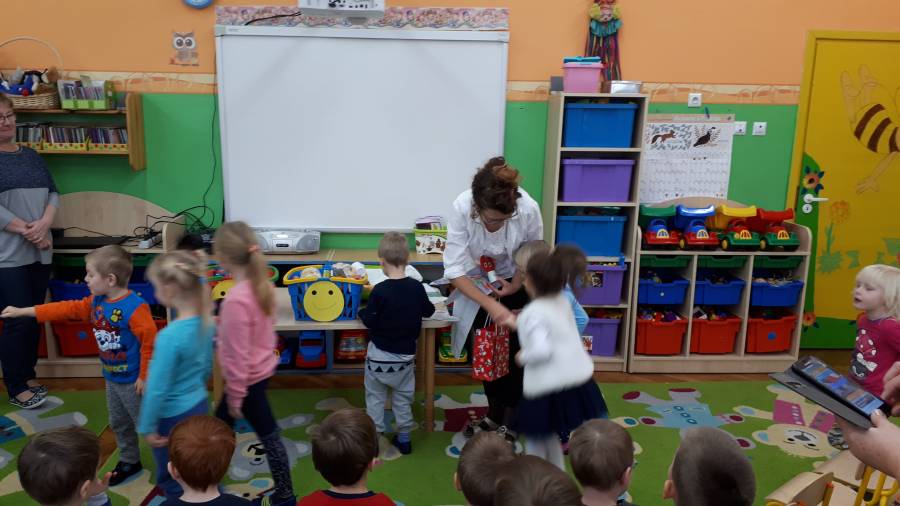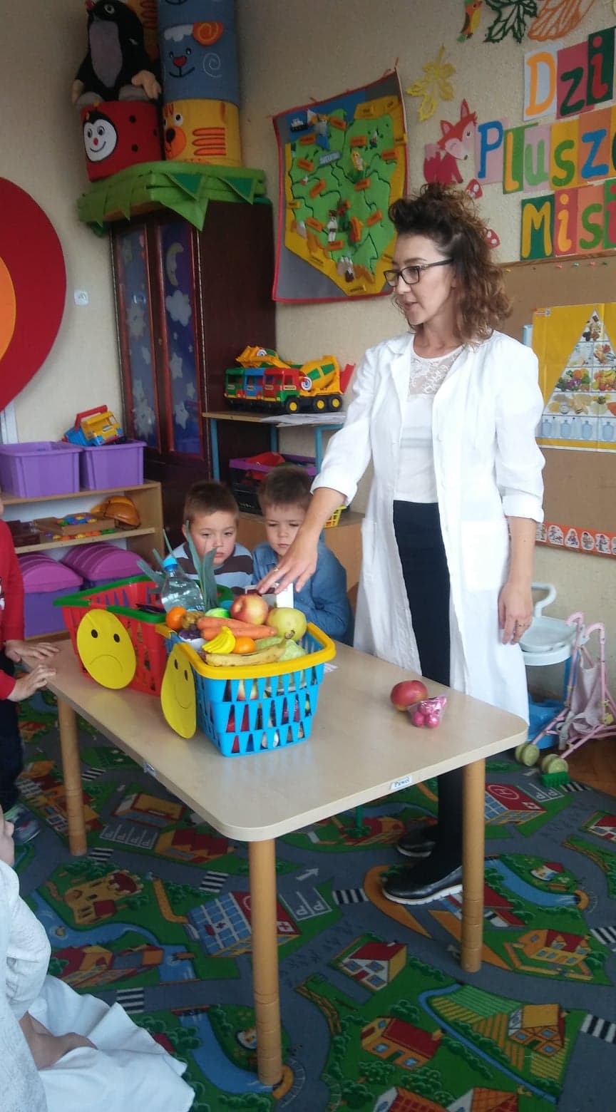 Podczas tygodnia "Dbamy o zdrowie" przedszkolaki poznawały zasady zdrowego trybu zycia. Dowiedziały się, że na nasze zdrowie ma wpływ wiele czynników: gimnastyka, spacery na swieżym powietrzu, odpoczynek, higiena osobista i zdrowe odżywianie. Sporo naszych przedszkolaków jest niejadkami dlatego zaprosiliśmy do przedszkola panią Martę Welter, która jest dietetykiem i opowiedziała dzieciom jak ważne dla naszego zdrowia jest odżywianie. Omawiała produkty żywnościowe na kolejnych piętrach piramidy żywieniowej - od tych najzdowszych i najbardziej wartosciowych po te, które w odżywianiu powinny się znaleźć w niewielkich ilościach. Na koniec dzieci brały udział w quizie i same decydowały, który produkt jest zdrowy a który nie umieszczając go w odpowiednim koszyku. Po spotkaniu dzieci zorganizowały poczęstunek ze zdrowych produktów. Spotkanie było bardzo interesujace i ciekawe. Bardzo dziękujemy pani Marcie za przybycie do naszego przedszkola.