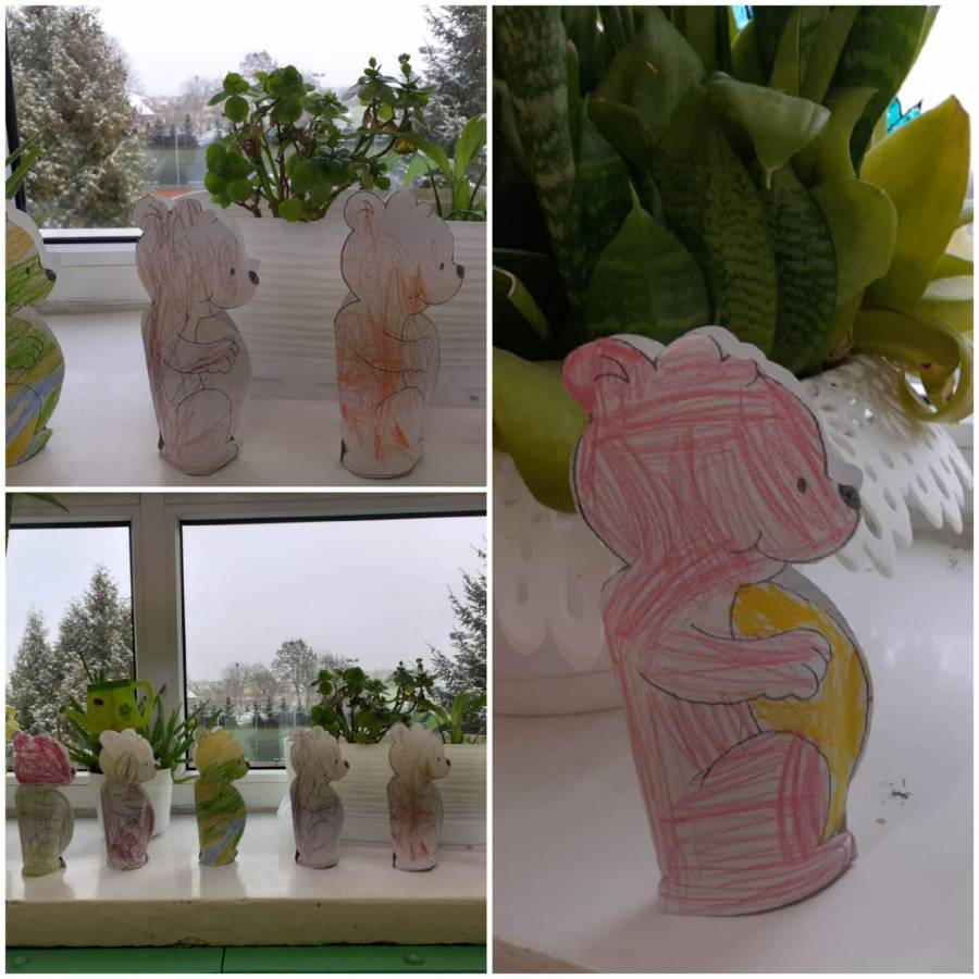 Motylki i Biedronki rozpoczęły " Misiowy Dzień" od poznania historii pluszowego misia, zwanego Teddy bear, jak dowiedziały się wczoraj na zajęciach z języka angielskiego oraz zapoznały się z jego pierwowzorem - niedźwiedziem. Potem wysłuchały opowiadania o Urodzinach Kubusia Puchatka - też misia. Następnie gościły Misia, który przeczytał nam książeczkę, jakże by inaczej, o misiu. Na koniec z pomocą (niewielką ) wykonały misie z ... ręczników.