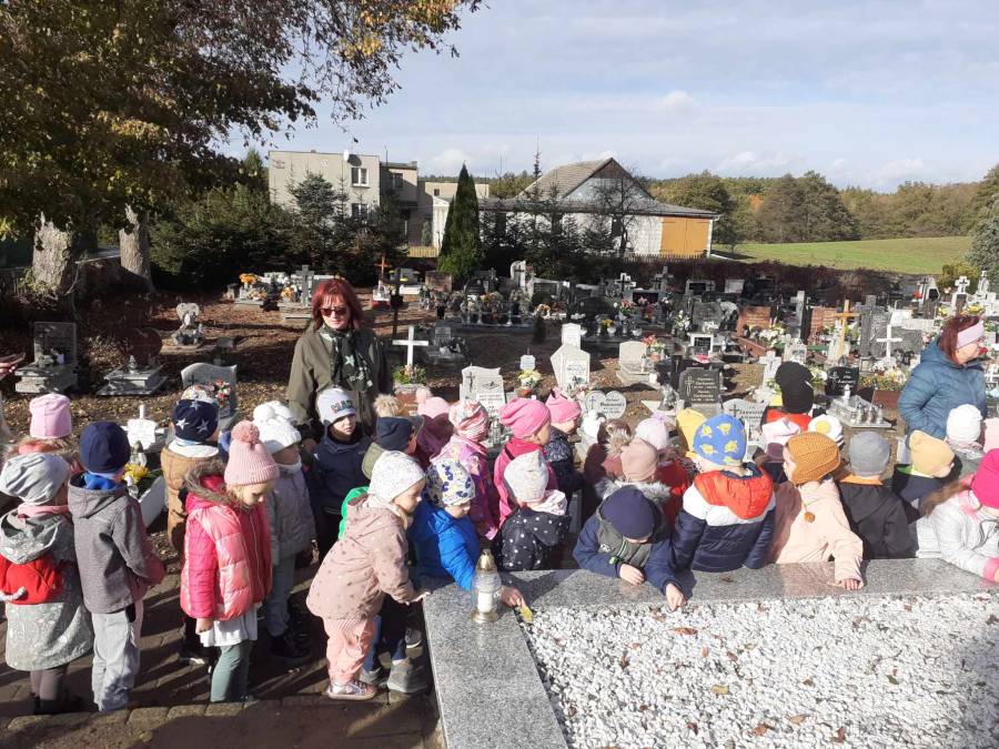 Przedszkolaki odwiedzily dziś miejscowy cmentarz. Zostawiliśmy zapalone znicze na grobie żołnierzy poległych podczas II wojny światowej, ale co najważniejsze, puściliśmy w świat modlitwę za wszystkich zmarłych. Dopóki płonie znicz, dopóty modlitwa trwa.