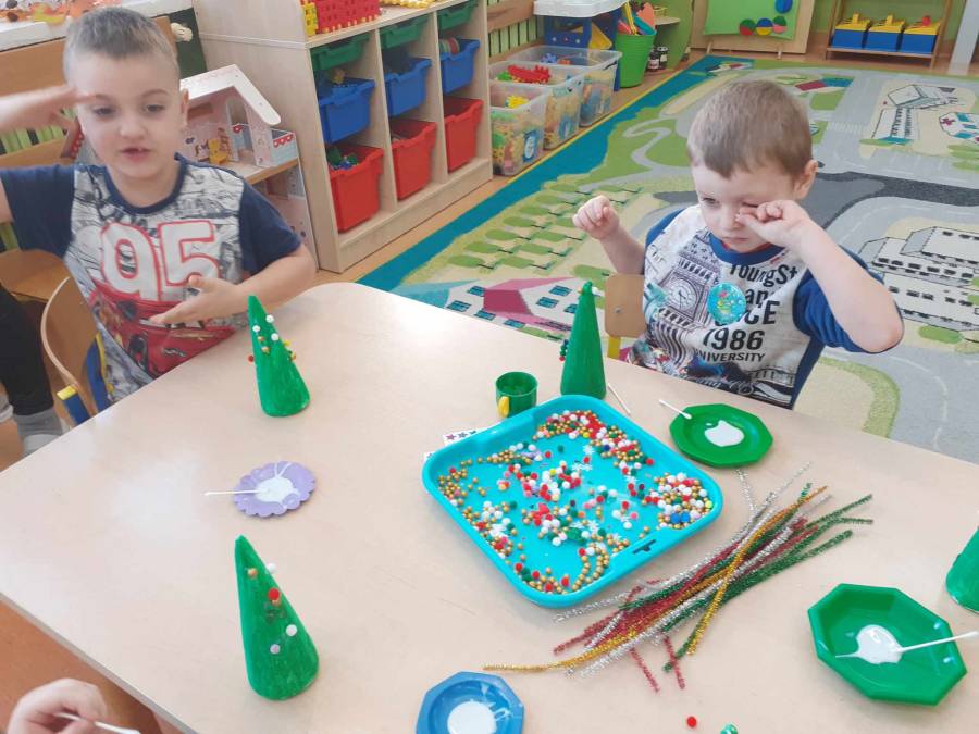 Chociaż do świąt Bożego Narodzenia pozostało jeszcze trochę czasu, w naszym przedszkolu już zapanowała świąteczna atmosfera, a to z powodu przygotowań do Jarmarku Adwentowo - Mikołajkowego, który odbędzie się 3.12. w szkolnej sali gimnastycznej. Podczas warsztatów świątecznych dzieci ze wszystkich grup ozdabiały styropianowe stożki zmieniając je w piękne choinki, które będzie można nabyć podczas jarmarku. Warsztaty przygotowali i pomagali przeprowadzić rodzice. Dochód ze sprzedaży choinek będzie przeznaczony na zakup materiałów do prowadzenia kreatywnych zajęć z dziećmi.