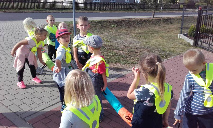 Dzieci z grupy "Smerfy" cały tydzień poznawały podczas zabaw i  zajęć prawidłowe i nieprawidłowe zachowania na ulicy, zasady ruchu drogowego, miejsca, w których można przechodzić przez jezdnię. Uczyły się znaczenia kolorów sygnalizacji świetlnej. Podczas wycieczki ulicami Świekatowa obserwowały ruch uliczny oraz poznawały znaczenie niektórych znaków drogowych.
