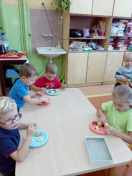 Kolorowa jesień zawitała do naszego przedszkola. Podczas zajęć dzieci wzbogacały i utrwalały wiedzę  na temat różnych owoców i warzyw oraz ich walorów zdrowotnych. Dzieci  w grupach Motylki, Biedronki, Pszczółki i Smerfy przygotowywały smakowite szaszłyki owocowe. Wszystkie przedszkolaki chętnie spożywały własnoręcznie przygotowane smakołyki.
