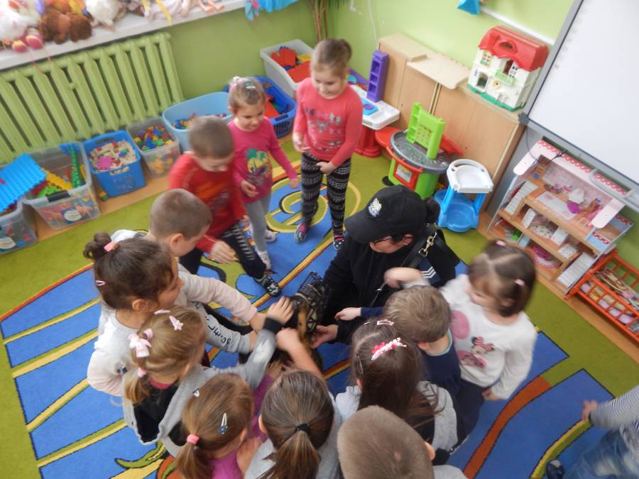 W dniu 16.11.2017 r. w naszym przedszkolu odbyło się niezwykłe spotkanie z panią policjantką sierżantem sztabowym Iwoną Czajkowską z Komendy Powiatowej Policji w Sępólnie Krajeńskim i Reksem czyli psem patrolowo -tropiącym, którym pani Iwona się opiekuje. Podczas spotkania przedszkolacy dowiedzieli się o tym jak bezpiecznie poruszać się po drogach, podróżować samochodem, bawić w domu i w przedszkolu, oraz jak reagować w sytuacji innych zagrożeń, np. zasłabnięcie kogoś bliskiego, pożaru itp.. Pani Iwona ostrzegała również przed osobami nieznajomymi, z którymi nie wolno rozmawiać, brać od nich czegokolwiek ani wpuszczać ich do domu. Dzieci poznały zasady obchodzenia się z obcym, nierzadko agresywnym psem, ćwiczyły postawę jaką powinny przyjąć podczas spotkania z takim zwierzakiem, dowiedziały się jakie zadanie ma do spełnienia pies policyjny patrolowo - tropiący na służbie. Reksio, który podczas całego spotkania był bardzo posłuszny swojej pani przewodnik, na zakończenie zaprezentował swoje umiejętności. Przedszkolaki zadawały mnóstwo pytań i czynnie uczestniczyły w spotkaniu, które odbyło się dzięki uprzejmości Inspektora Pawła Zawady z Komendy Powiatowej Policji w Sępólnie Krajeńskim.